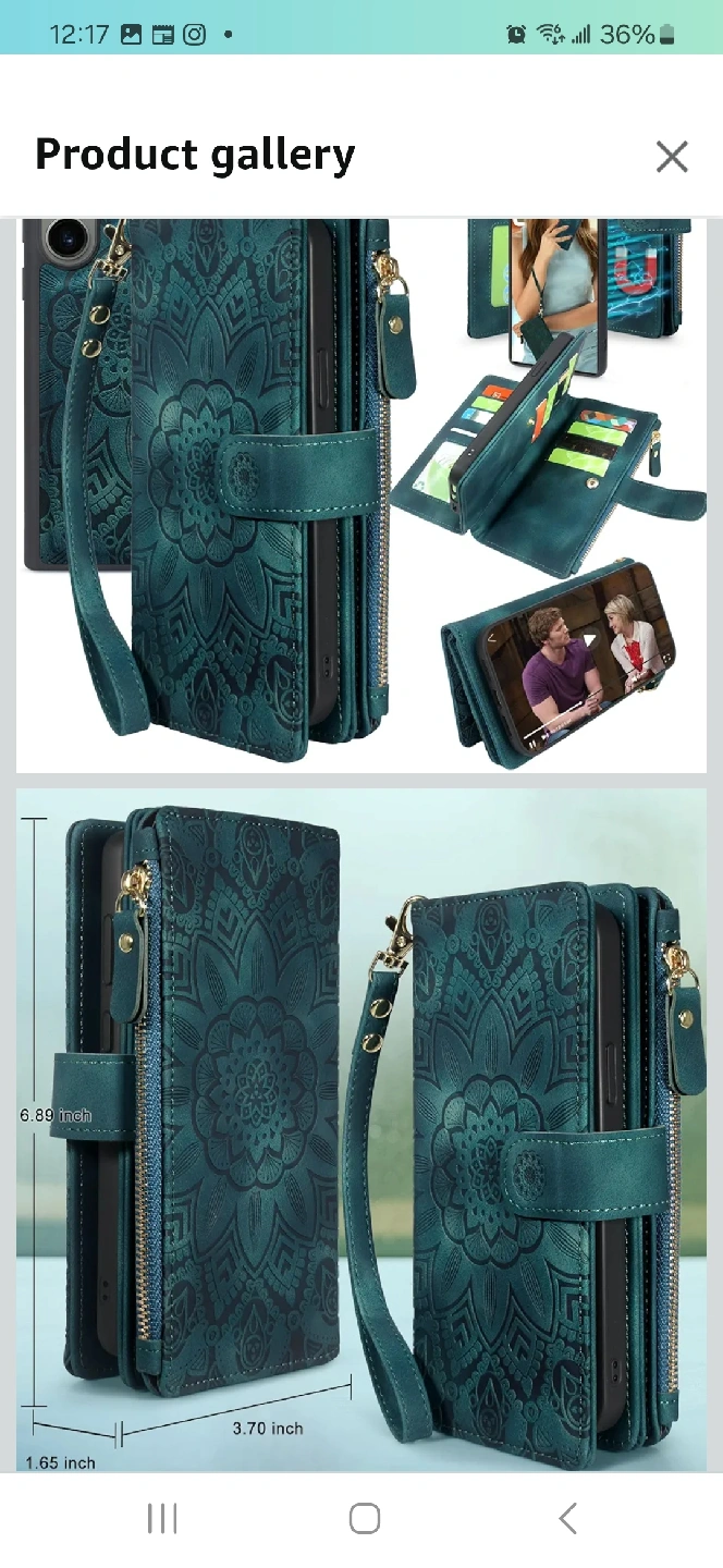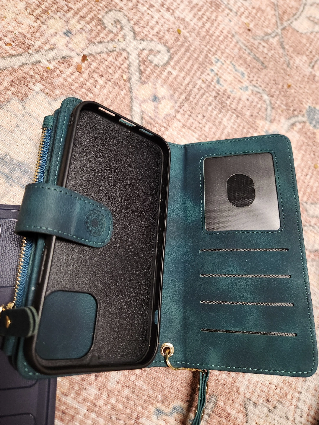 10Selling a teal wallet case for your phone! It's a 2-in-1 design, so it can be used as a detachable wallet case or a zipper purse. The dimensions are: - 6.89 inches in height - 3.70 inches in width - 1.65 inches in depth