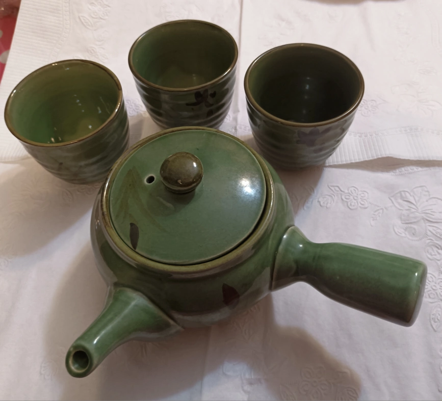 A set including a teapot and three cups. The teapot has a lid with a knob and a handle. The teapot and cups have green and brown colouring and floral designs. (only pick up)