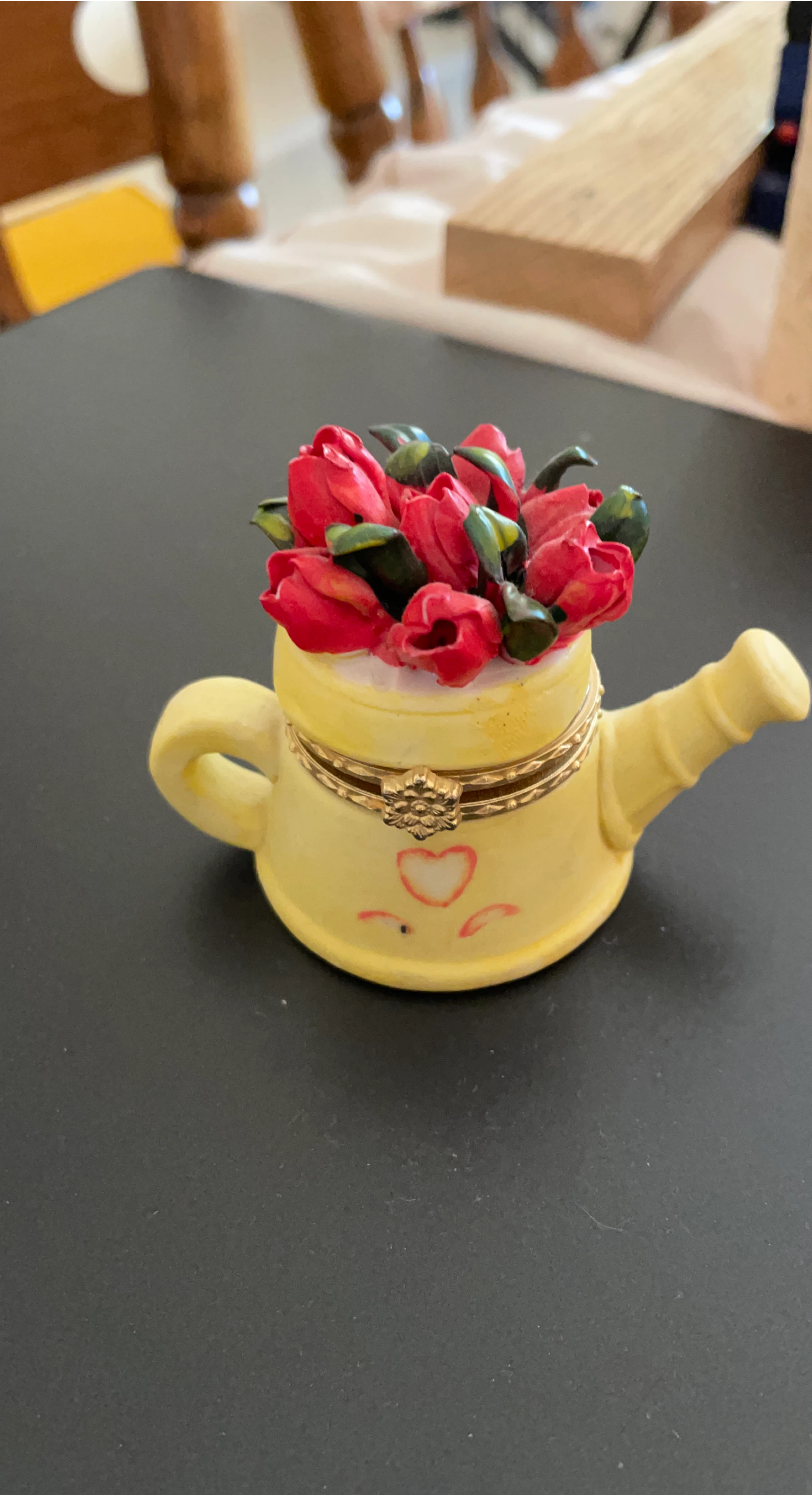 80A cute little teapot trinket box! It's a lovely yellow colour and has a bouquet of red flowers on top. Perfect for storing small jewelry or other treasures