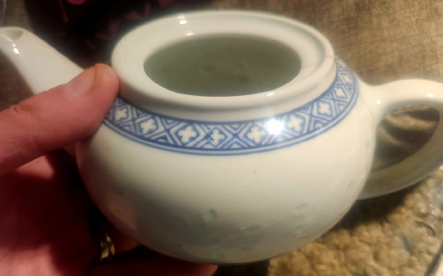 Selling a cute teapot with a blue and white geometric design around the top. It's perfect for brewing a cup of tea! Made in China. Pick up only.