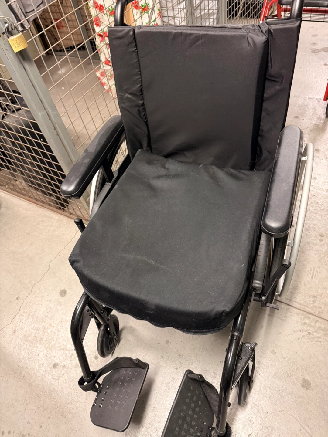 This is a black wheelchair from Motion Composites. It's designed for mobility assistance. The frame is black with silver spoked wheels.