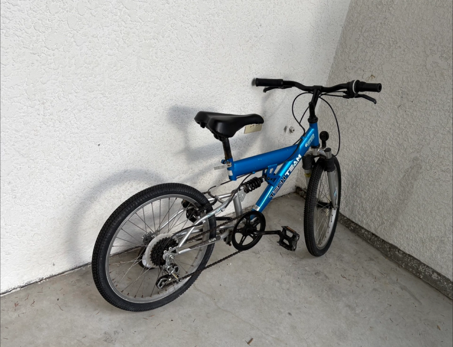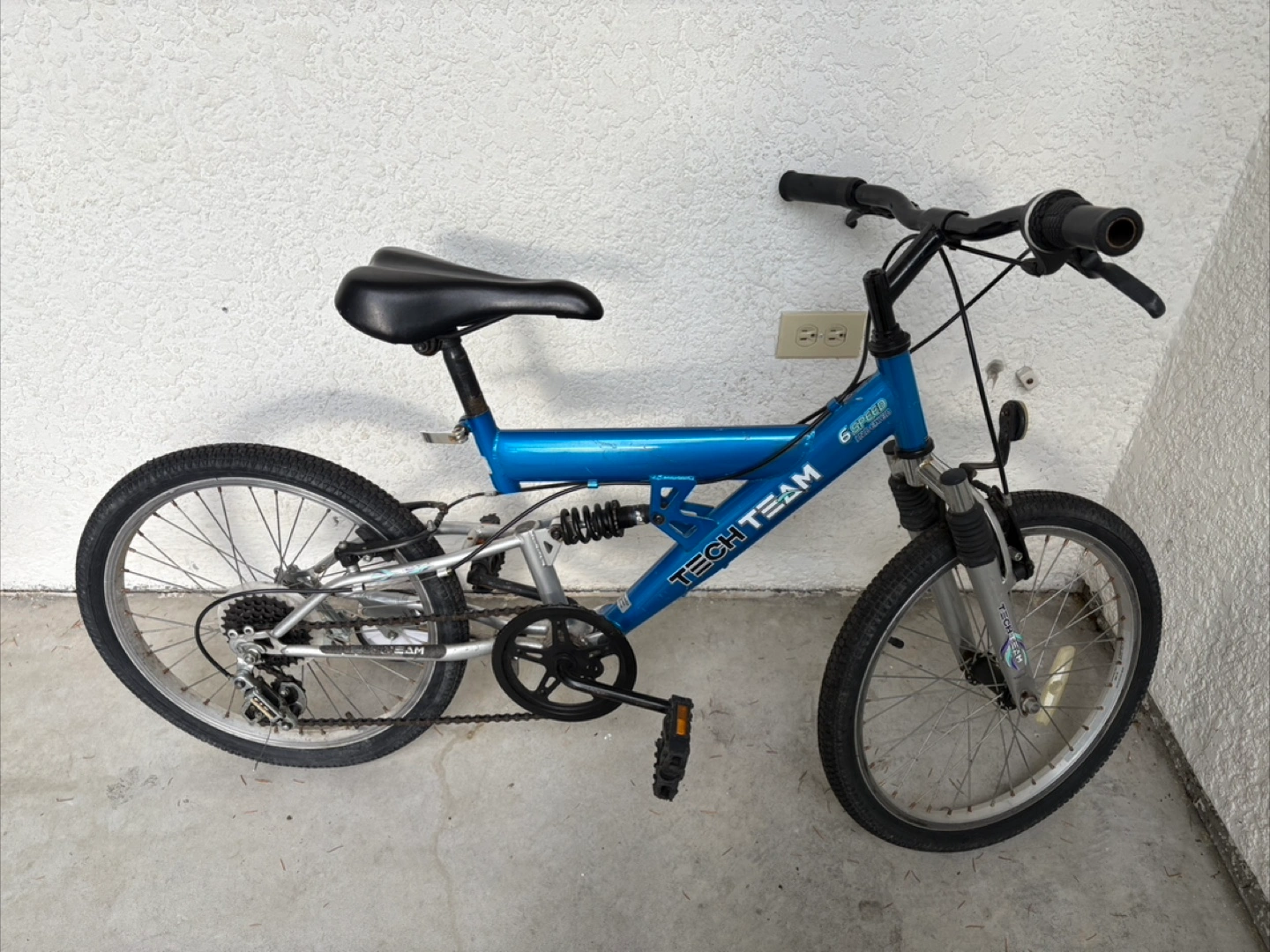 Blue mountain bike. Handlebars, seat, and pedals visible. A great way to enjoy the outdoors. In very good condition. 20 inches wheel.