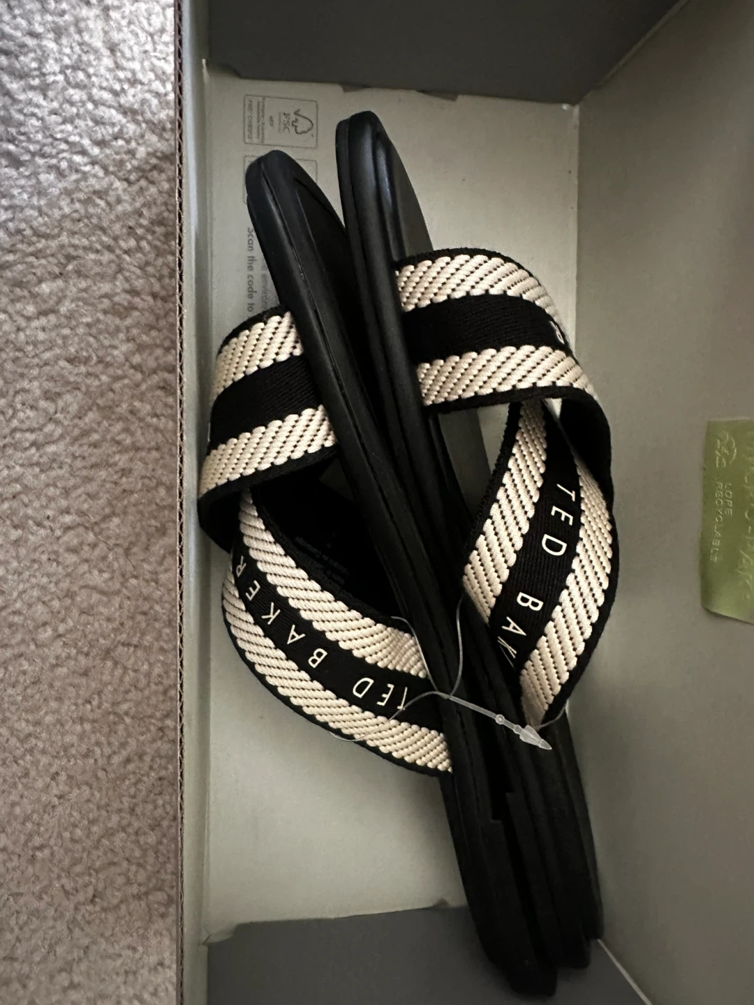 10These Ted Baker London slides are in great condition and come with the original box! They are a size 8 and feature a stylish black and white criss-cross strap with the Ted Baker logo. Perfect for summer!