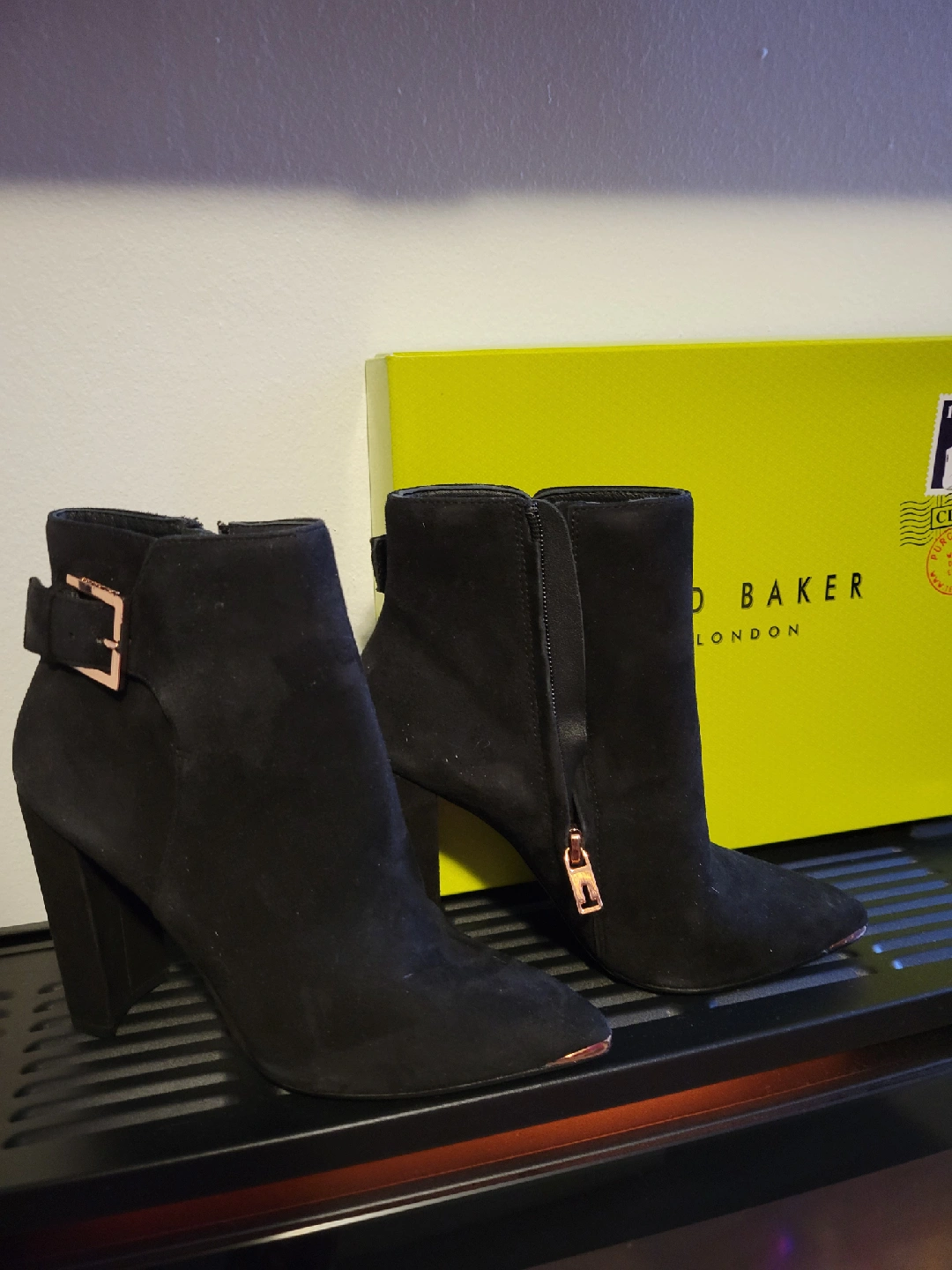 10Selling a pair of Ted Baker Monicaa ankle boots in black suede,come with the original box! The size is US 6 / EU 36. These stylish boots feature a block heel and a sleek design, perfect for dressing up or down