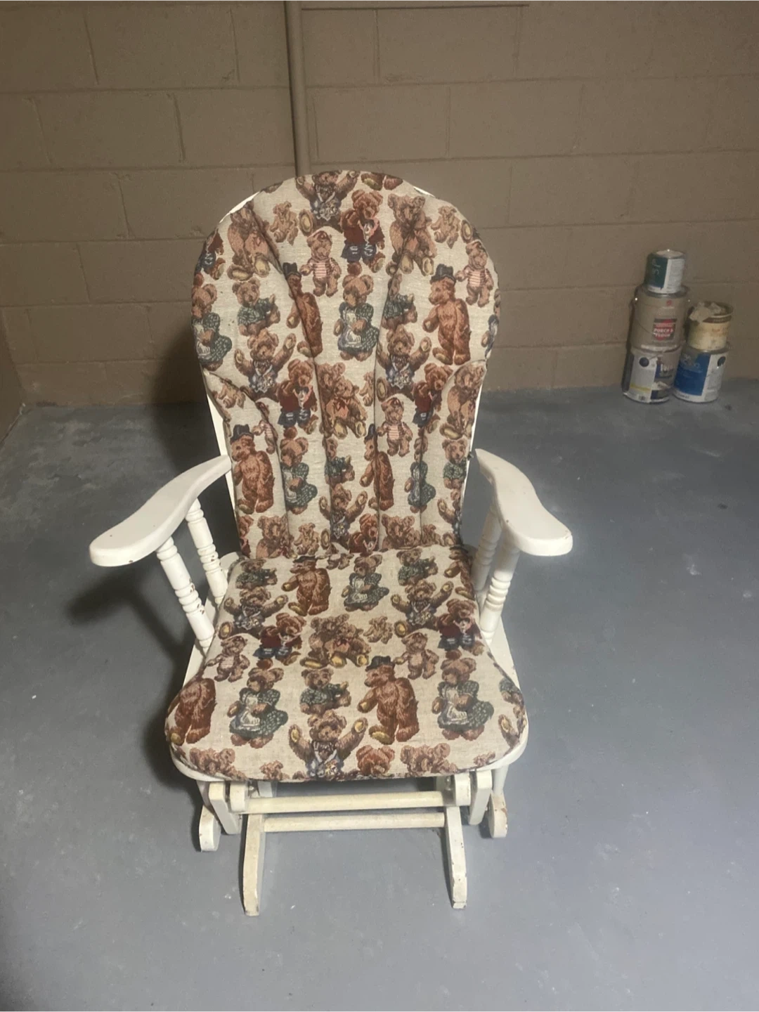 10This is a rocking chair with a cute teddy bear print cushion! The frame is painted white. It would be a great addition to a nursery or child's room