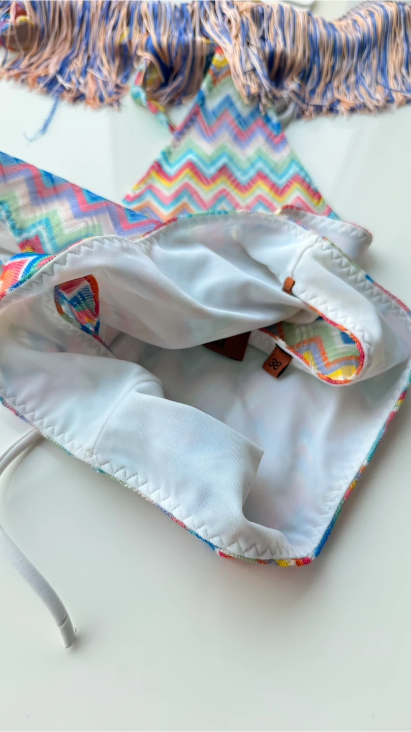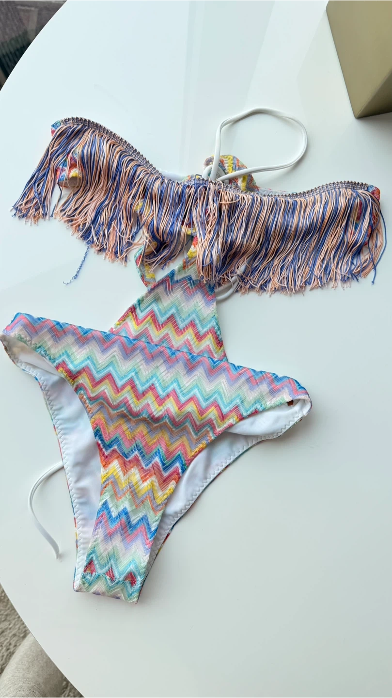 Authentic Missoni one-piece swimsuit with signature zigzag print and fringe bandeau top. From the exclusive capsule collection. Bright multicolor pattern, very eye-catching and perfect for resort, beach, and pool looks.