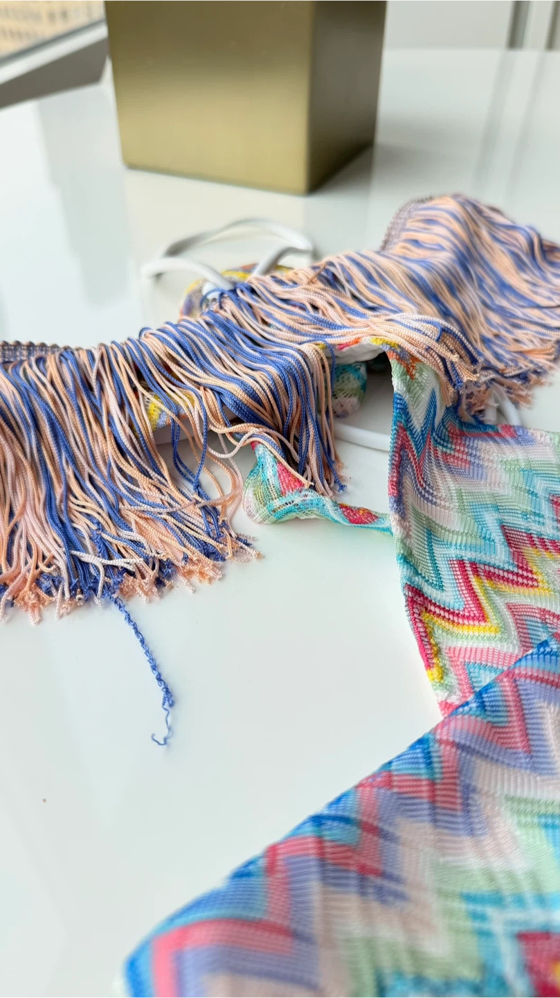 Authentic Missoni one-piece swimsuit with signature zigzag print and fringe bandeau top. From the exclusive capsule collection. Bright multicolor pattern, very eye-catching and perfect for resort, beach, and pool looks.
