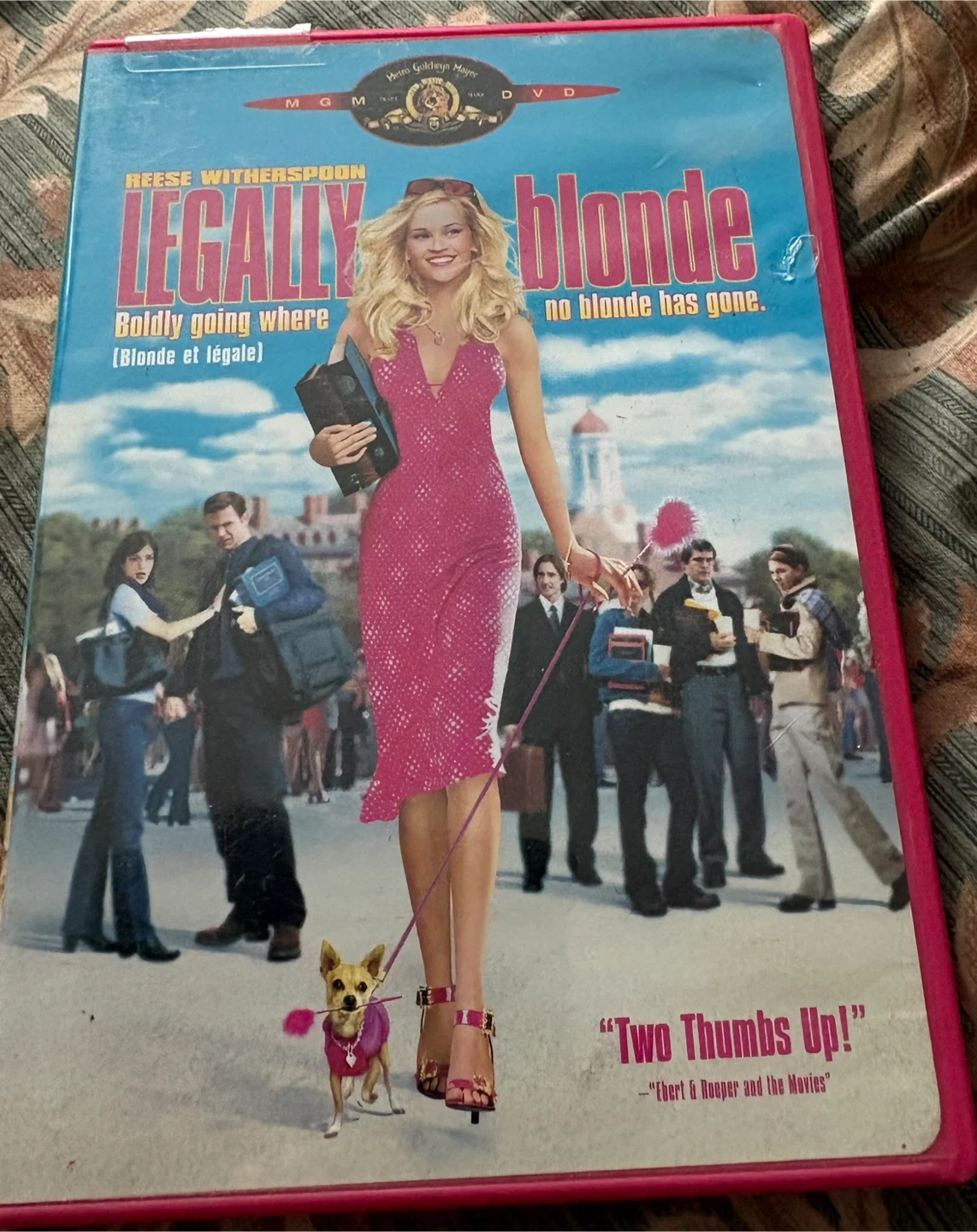 This is the Legally Blonde DVD, starring Reese Witherspoon. It's a comedy about a fashion-conscious student who goes to Harvard Law. The movie includes the tagline 'Boldly going where no blonde has gone.'