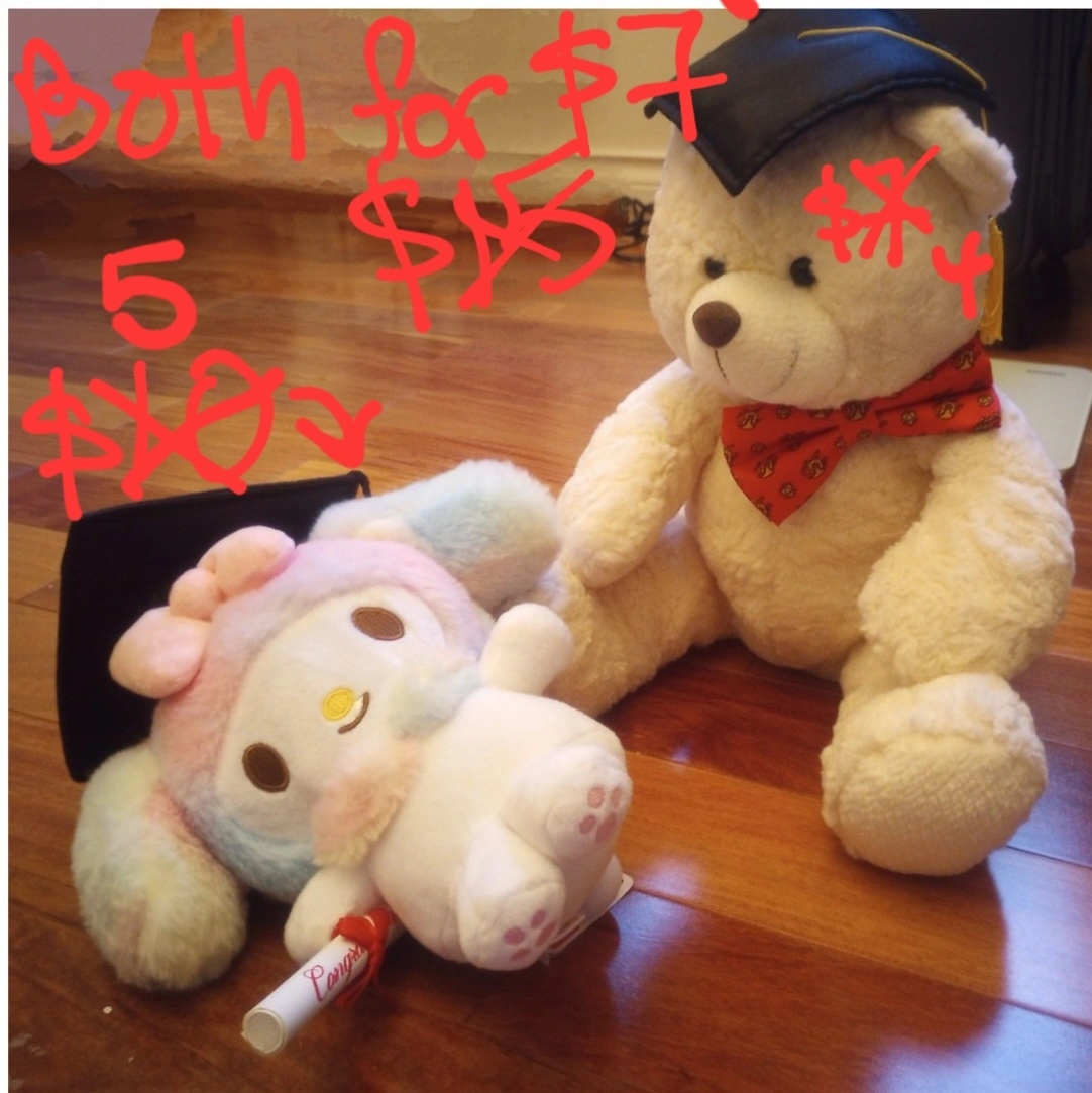 85Tedy bear graduation soft toy. One is a pastel My Melody plushie (sold), and the other is a beige teddy bear wearing a graduation cap and bow tie($3). I brought them just for pictures when I graduated. tags still attached. take all my soft toys listed for $10 pickup at 63rd West & Yukon St Or Marine Drive Station.