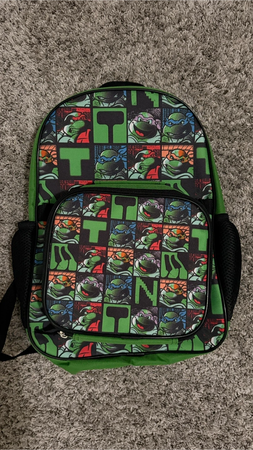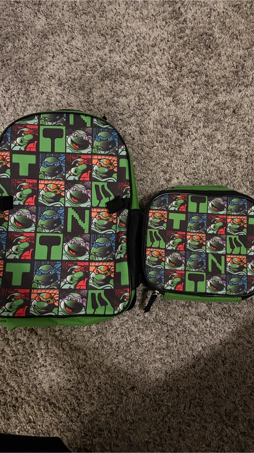 17Here's a fun Teenage Mutant Ninja Turtles backpack with a matching lunch bag! The backpack is green with a cool TMNT pattern, perfect for any little turtle fan