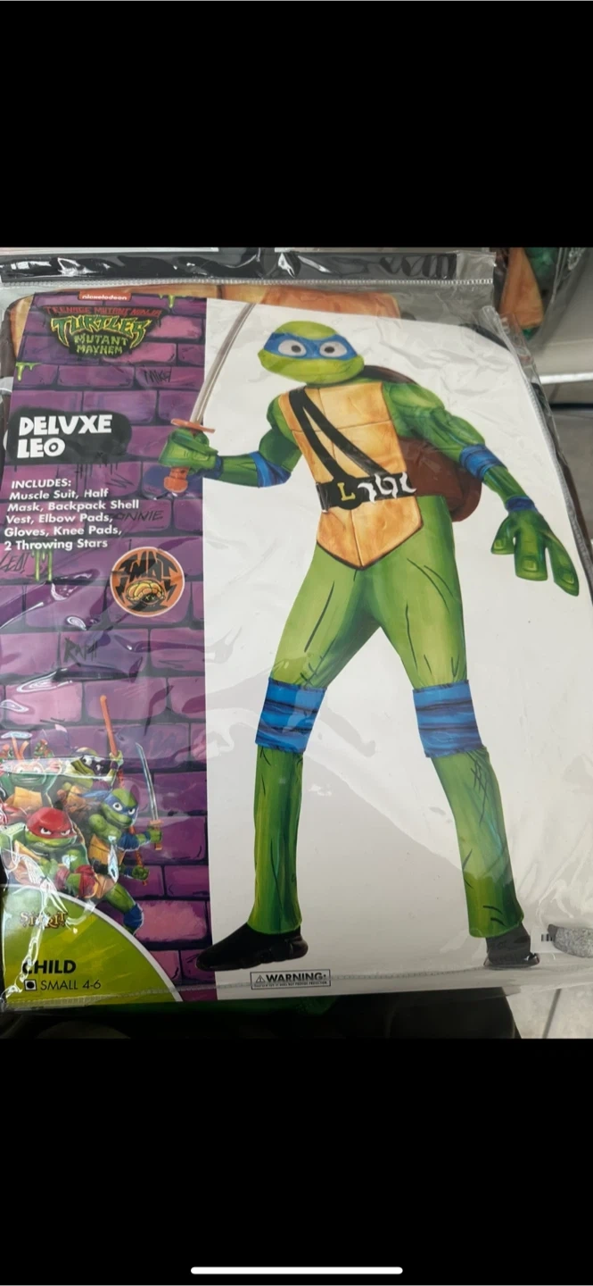 18Get your little one ready for Halloween or dress-up with this Deluxe Leonardo costume from Teenage Mutant Ninja Turtles! This set includes: - Muscle suit - Half mask - Backpack shell - Vest - Elbow pads - Gloves - Knee pads - 2 throwing stars Fits child size small (4-6)