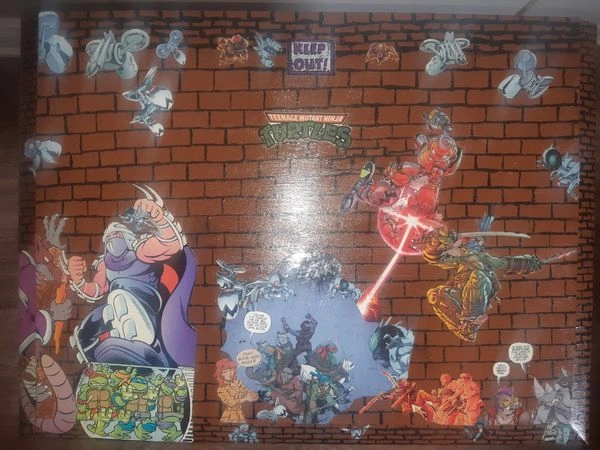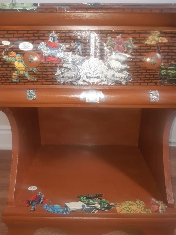 65This is a unique Teenage Mutant Ninja Turtles themed Collage side table refinished from scratch. It features comic book panels and character images. Perfect for a TMNT fan's room or as a quirky addition to any space.