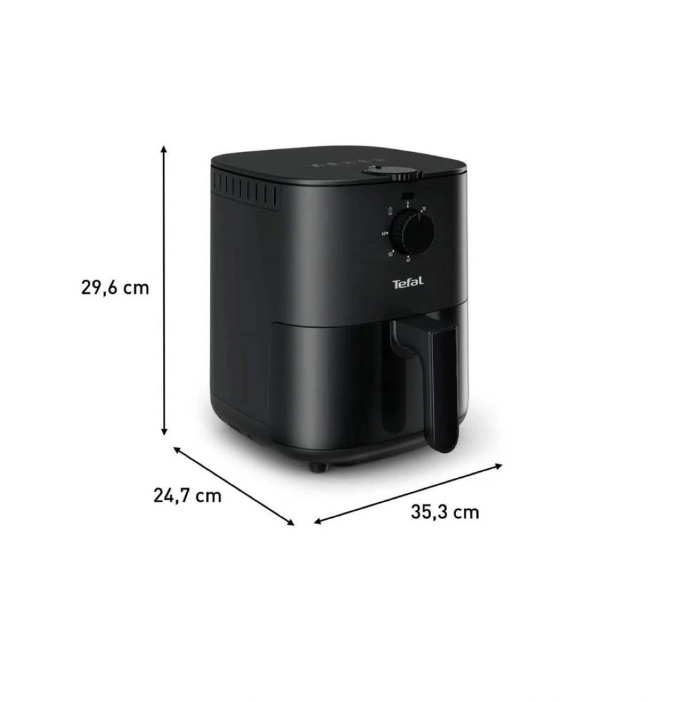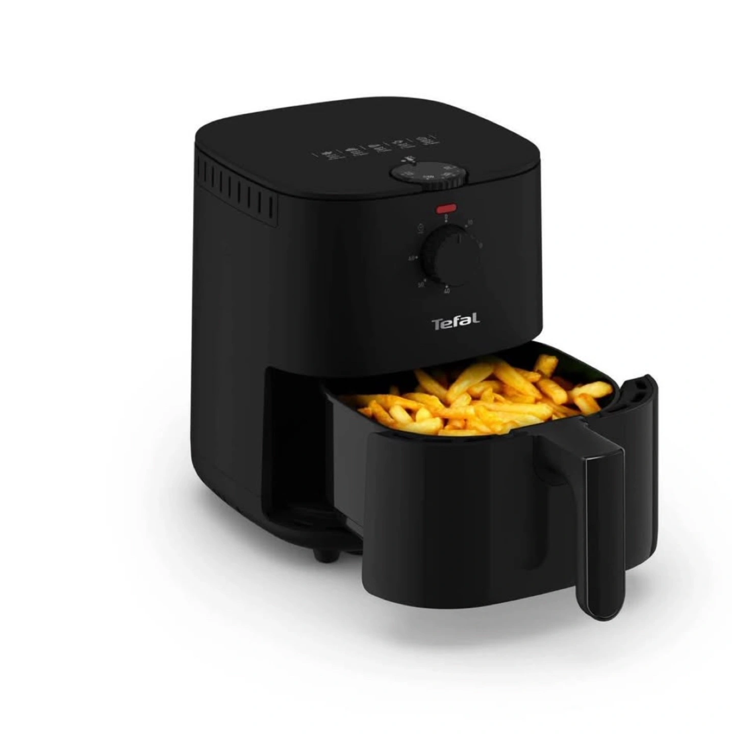 Black air fryer. Compact design. Easy to use controls. Great for small kitchens. Makes crispy fries.