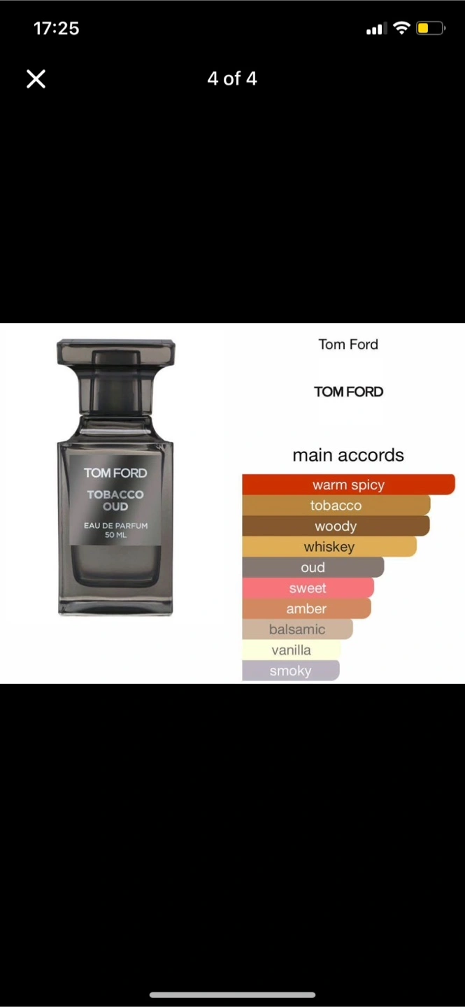 Selling a bottle of Tom Ford Tobacco Oud Eau de Parfum. It's a 50ml bottle. The main accords are warm spicy, tobacco, woody, and whiskey, with hints of oud, sweet amber, balsamic, vanilla, and smoky notes.