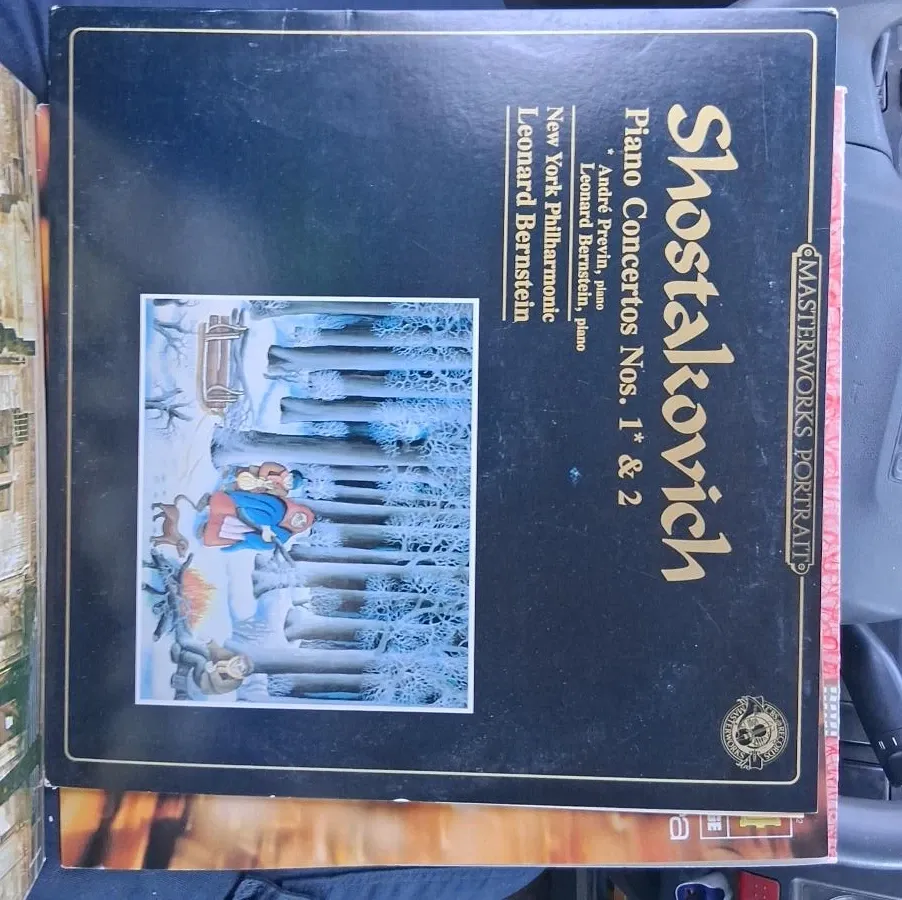 Shostakovich Piano Concertos Nos. 1 & 2 album. Features Leonard Bernstein conducting the New York Philharmonic with André Previn and Leonard Bernstein on piano. Masterworks Portrait series.