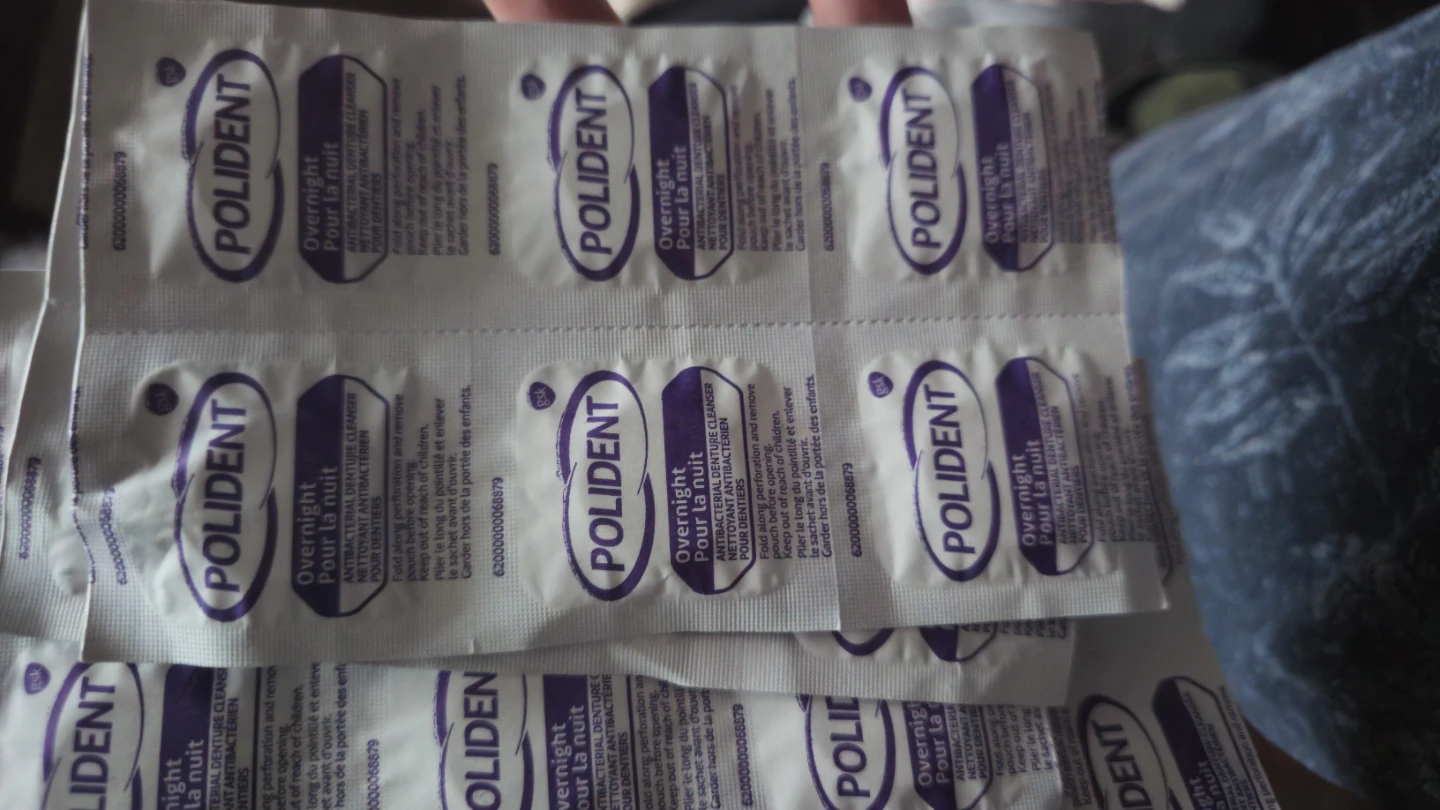 Polident Overnight is an antibacterial denture cleanser designed for a deep clean. It comes in convenient single-use pouches. This cleanser is for dentures only. So I don't need to use them and have a few strips of that.