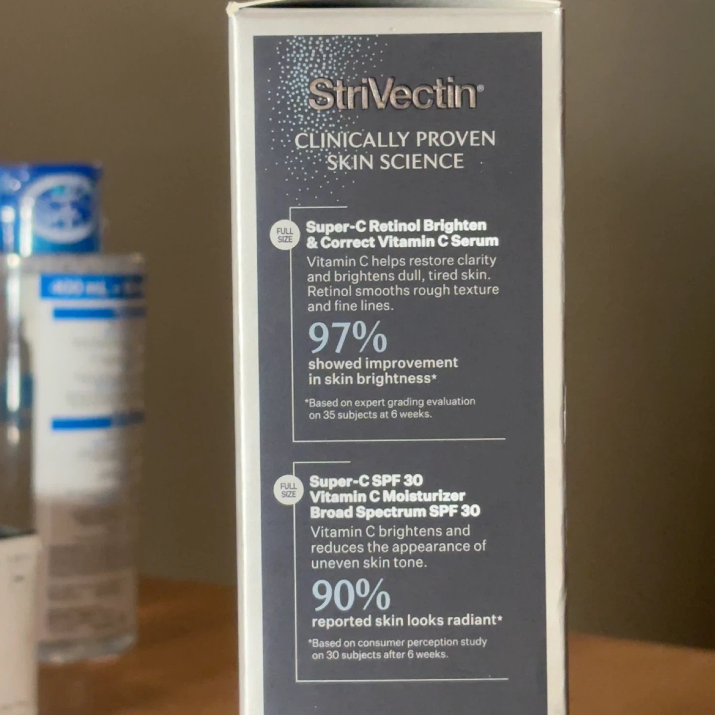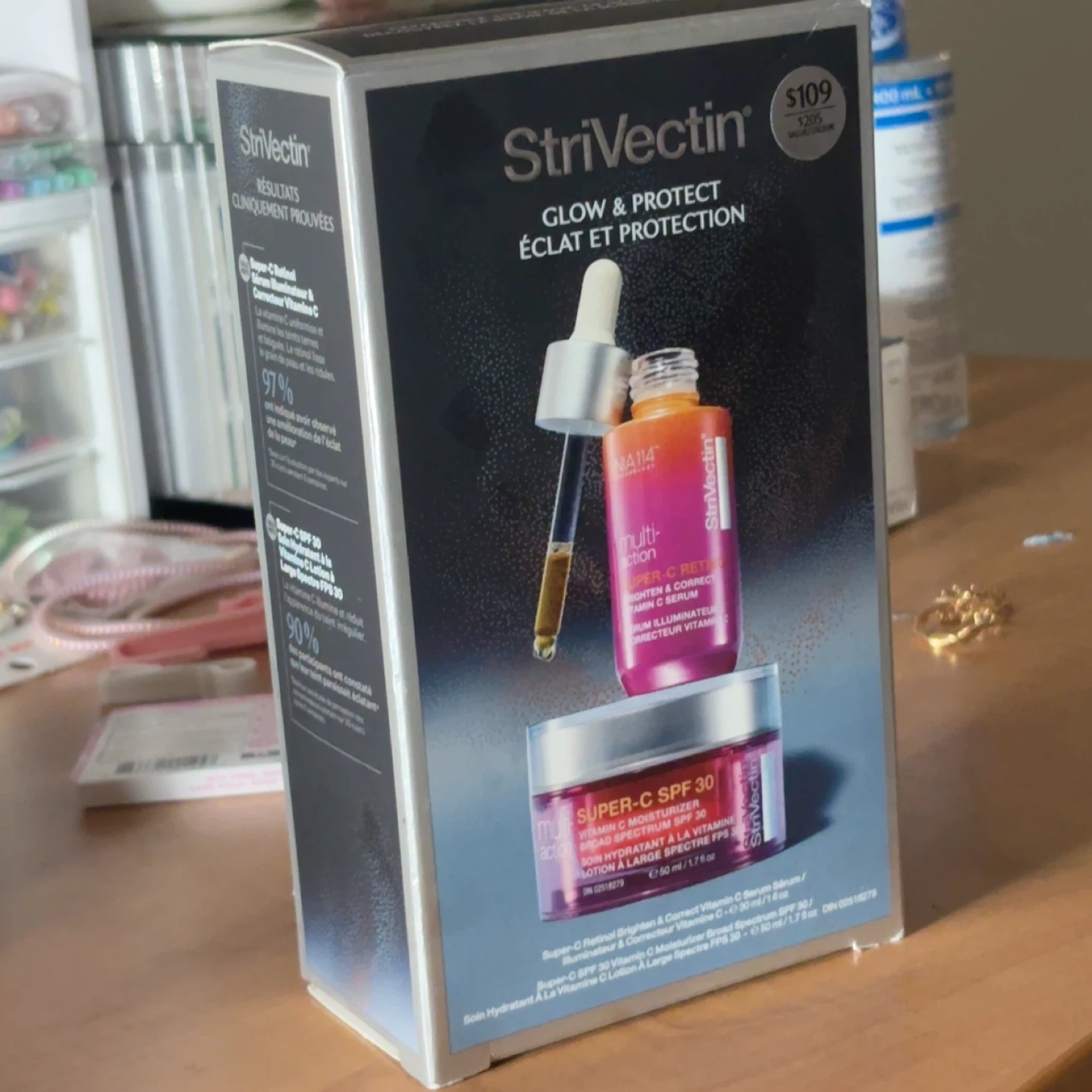 This Strivectin set includes the Super-C Retinol Brighten & Correct Vitamin C Serum and the Super-C SPF 30 Vitamin C Moisturizer. Each product is 30 ml / 1 fl oz. It's designed to illuminate and protect your skin. Perfect for a last minute gift!