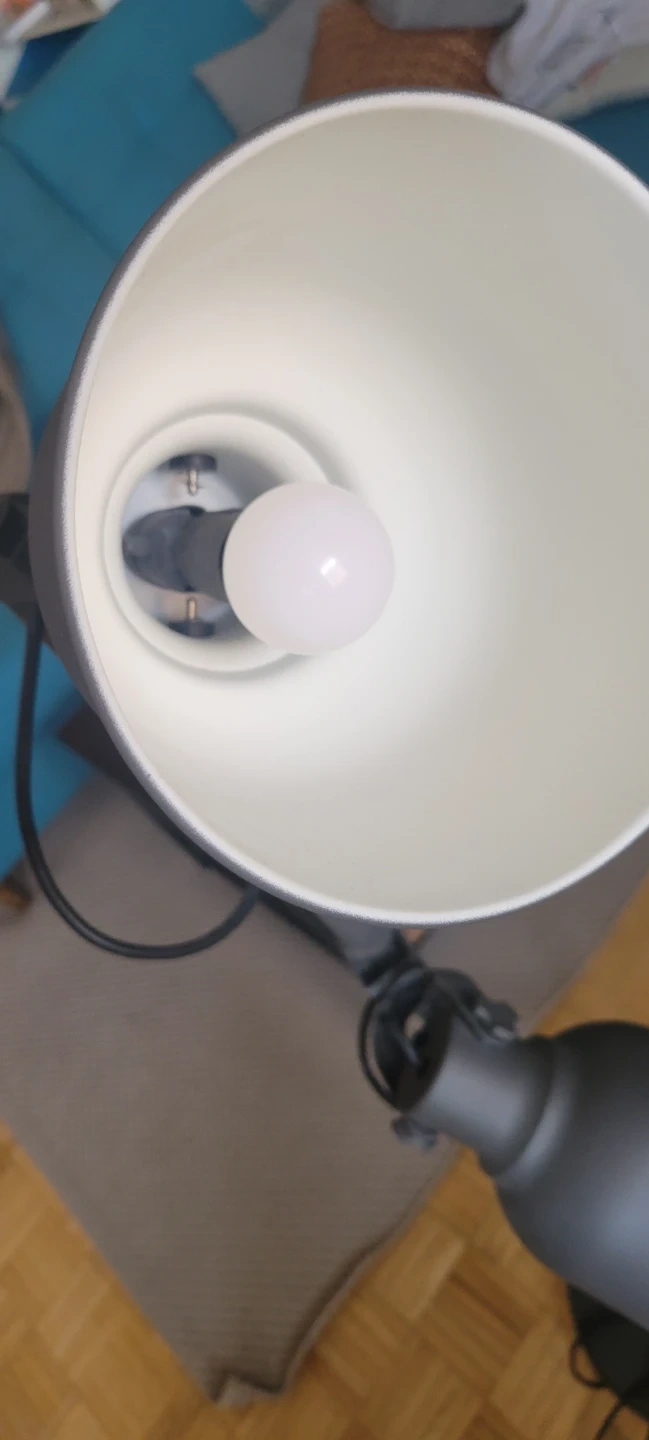 Adjustable grey floor lamp with 3 gooseneck spotlights. Metal construction. It's the Hektar model from IKEA. Comes with extra bulbs