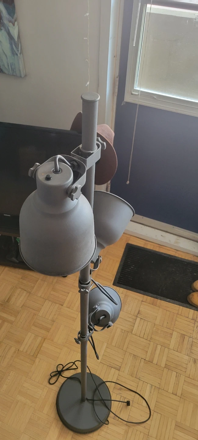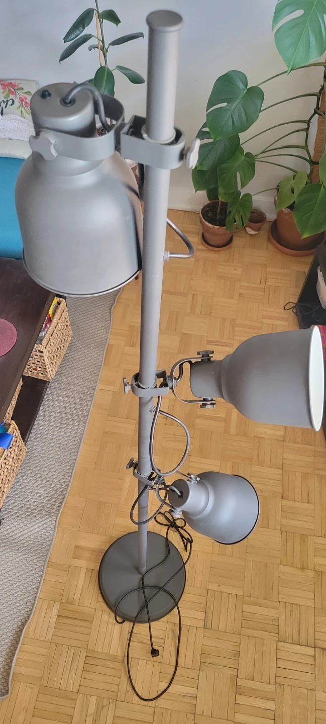 Adjustable grey floor lamp with 3 gooseneck spotlights. Metal construction. It's the Hektar model from IKEA. Comes with extra bulbs