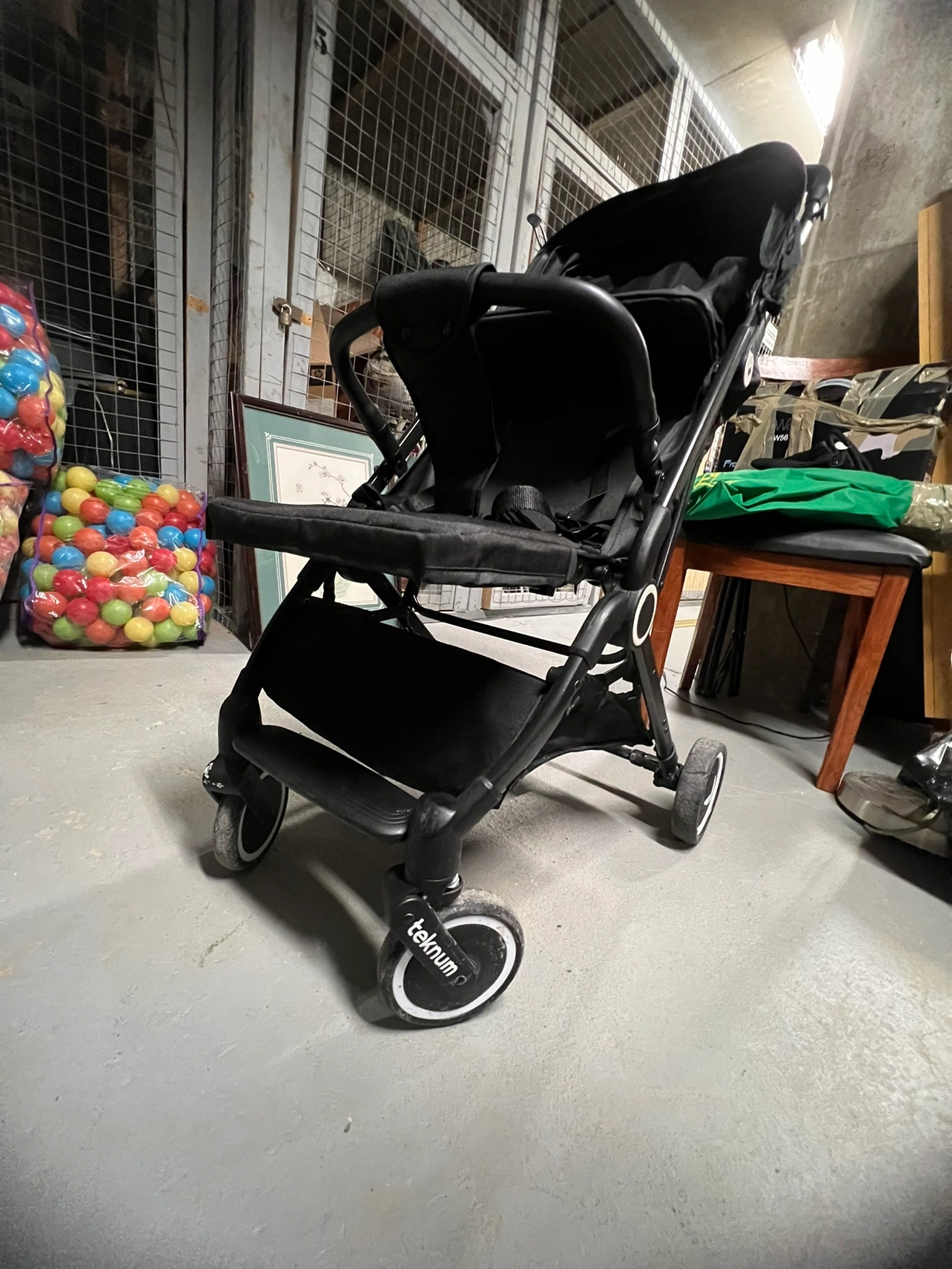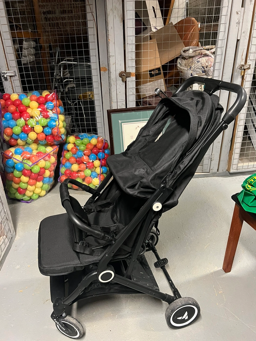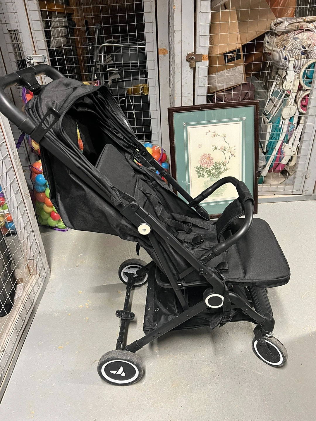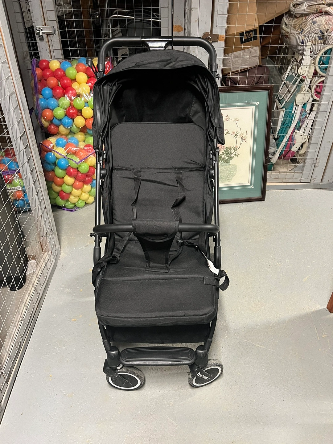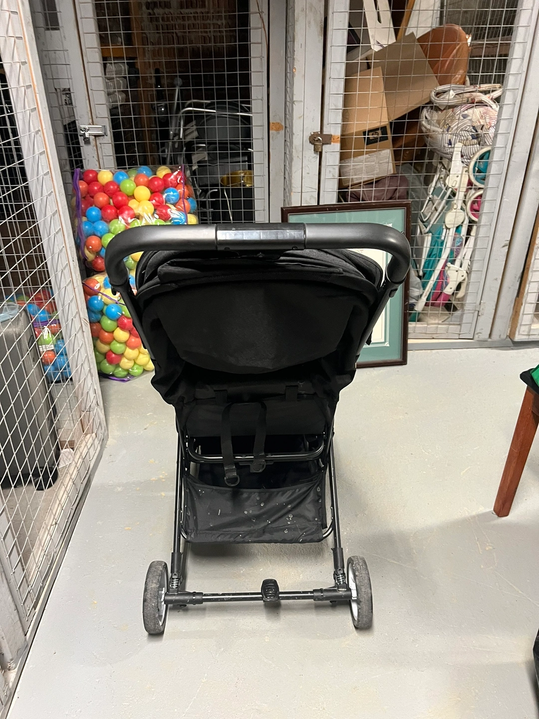 Black stroller, lightweight and compact. Folds easily and has a large storage basket.
