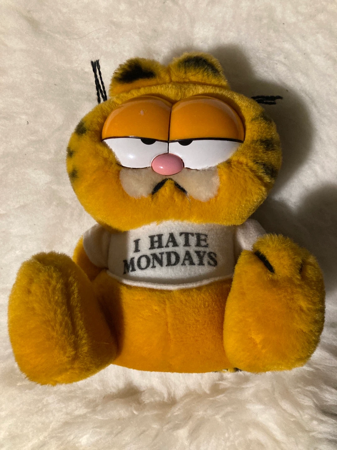 This is a classic Garfield plush toy with an "I Hate Mondays" t-shirt. 20cm height . This makes a fun collectible for any Garfield fan!