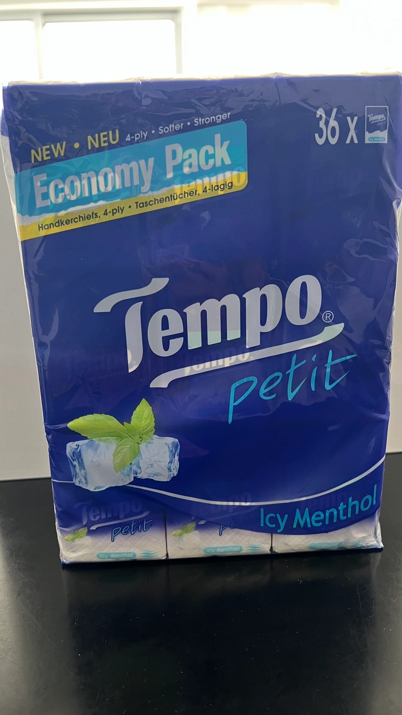New Tempo Petit tissues. Icy Menthol scent. 36 pack. 4-ply. Economy pack.