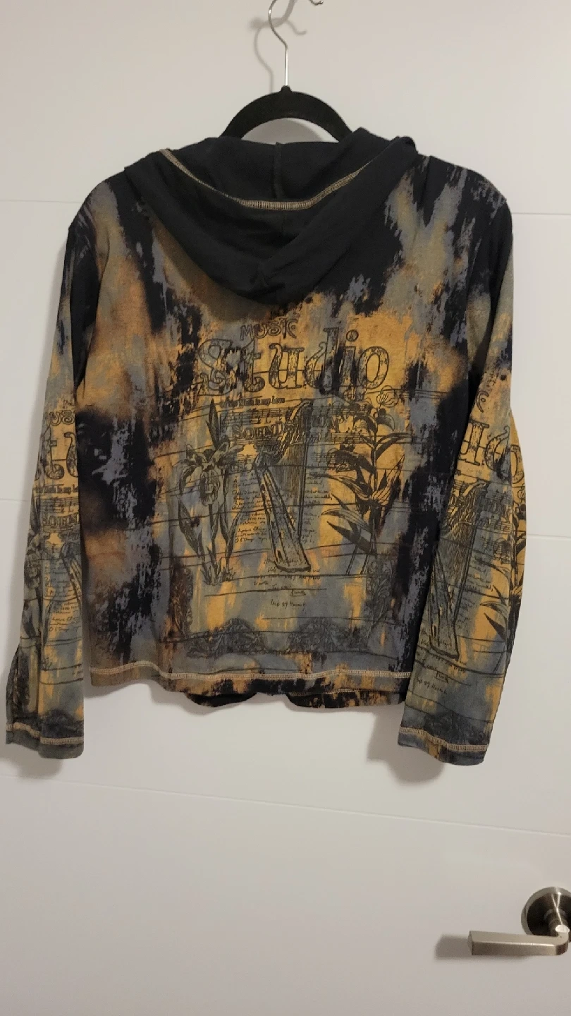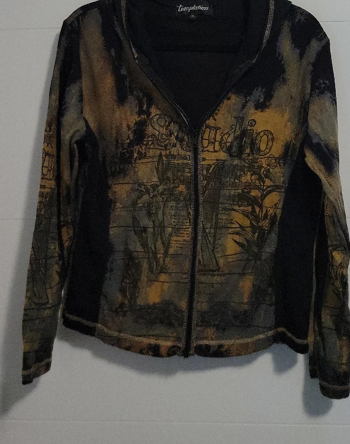 65Here's a Temptation zip-up hoodie in size XL. It has a unique design with a music studio theme. Perfect for adding a bit of artistic flair to your wardrobe!