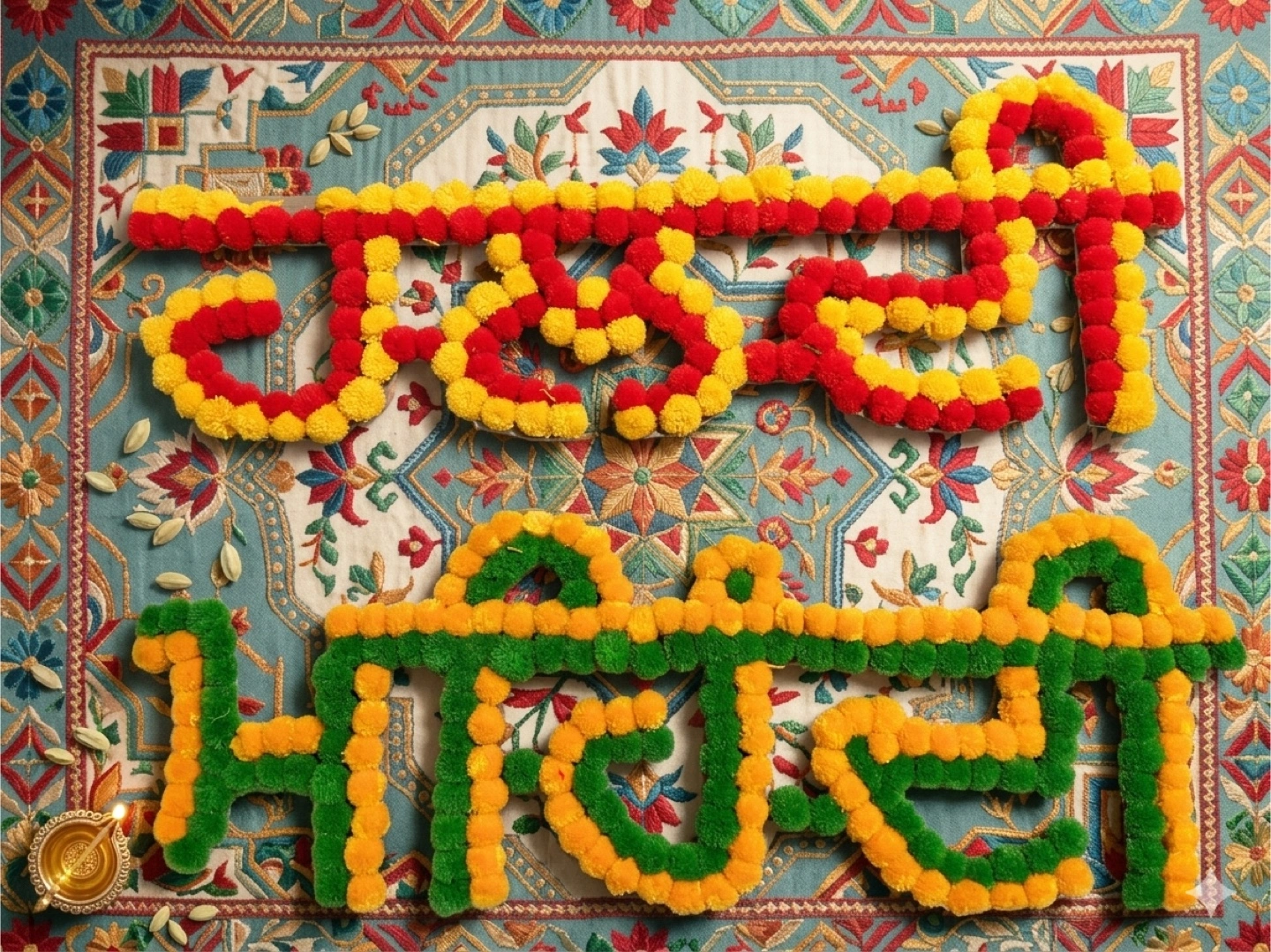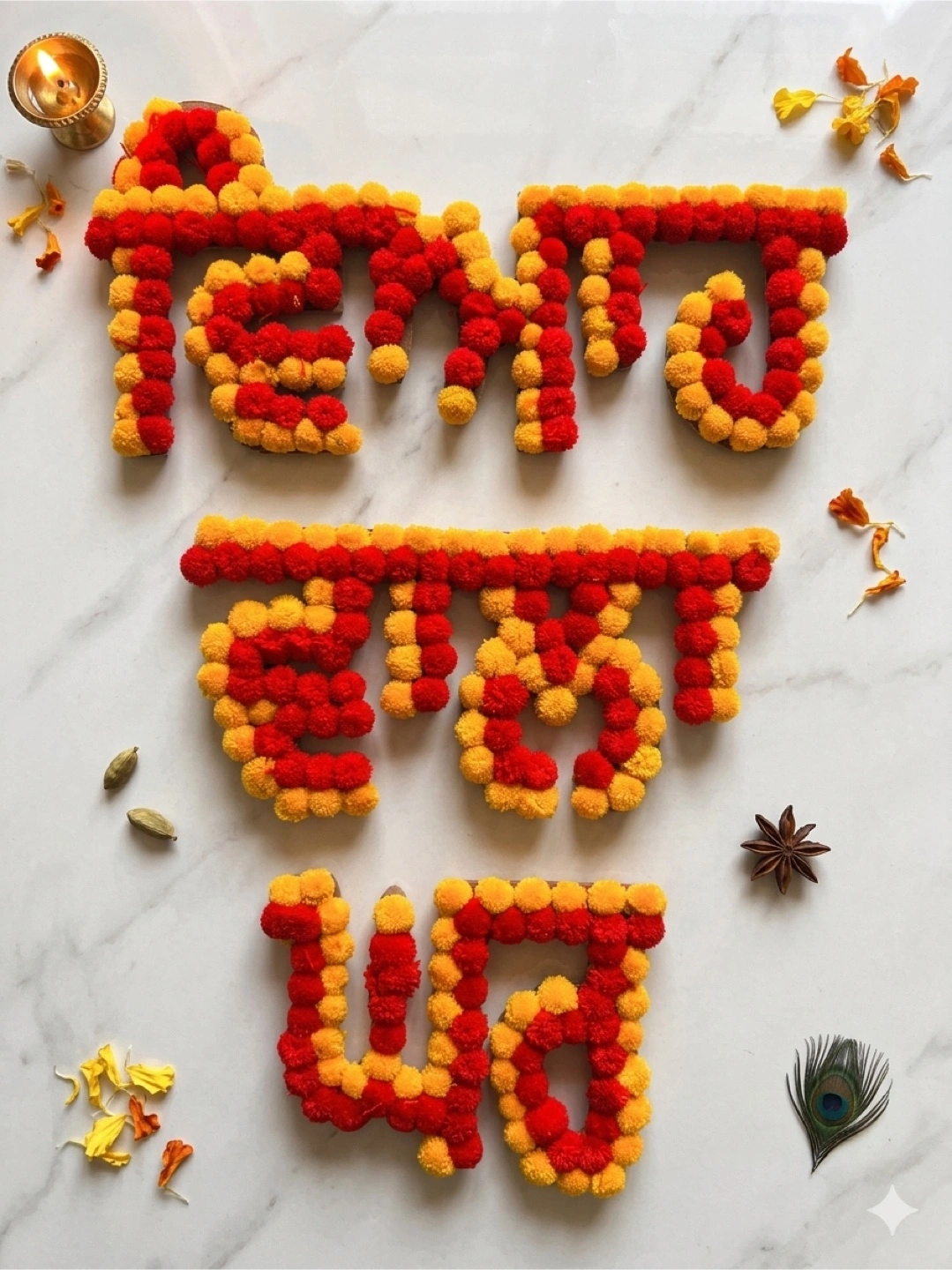 Set of two floral wall decorations made of marigolds and fabric pom-poms. Red, yellow, and green colours. Perfect for festive occasions and home decor. Adds a vibrant touch to any space!