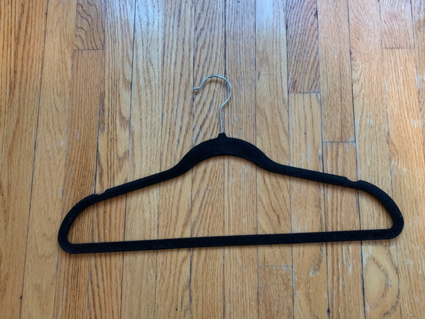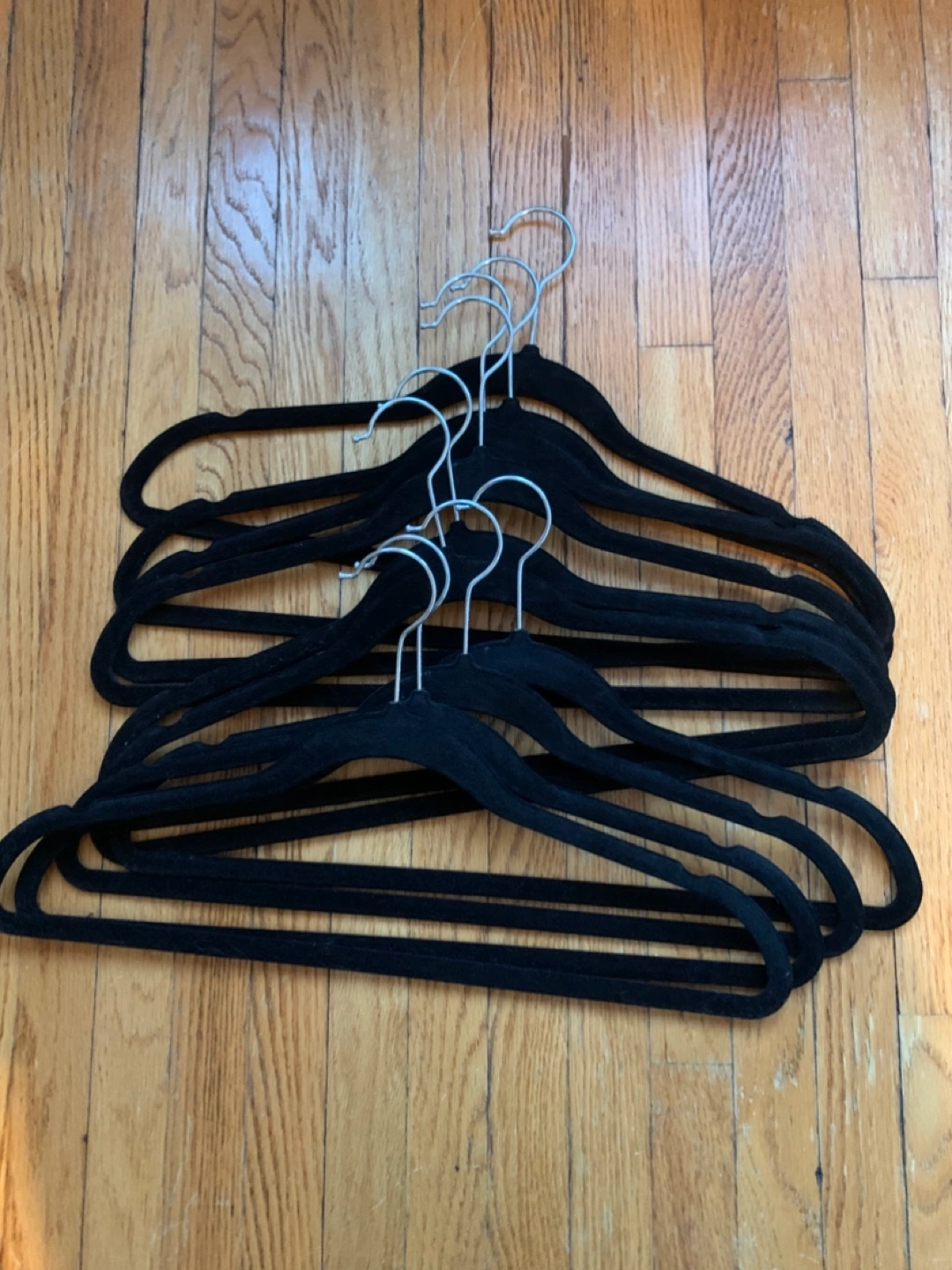 139Set of ten black velvet hangers. Non-slip. Great for organizing closets. Silver metal hook.