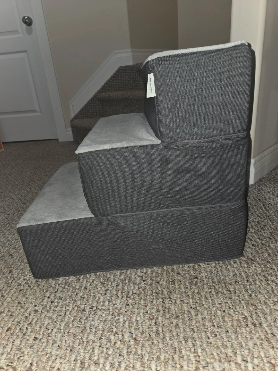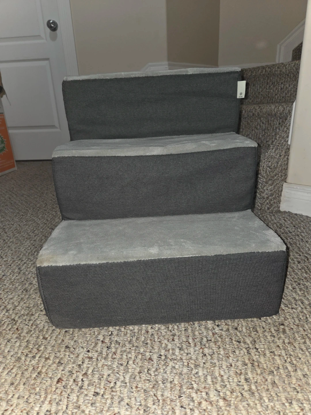 Three-step pet stairs in charcoal grey. These stairs are made with foam and covered in fabric. They're a great way to help pets reach high places! Perfect for senior dogs