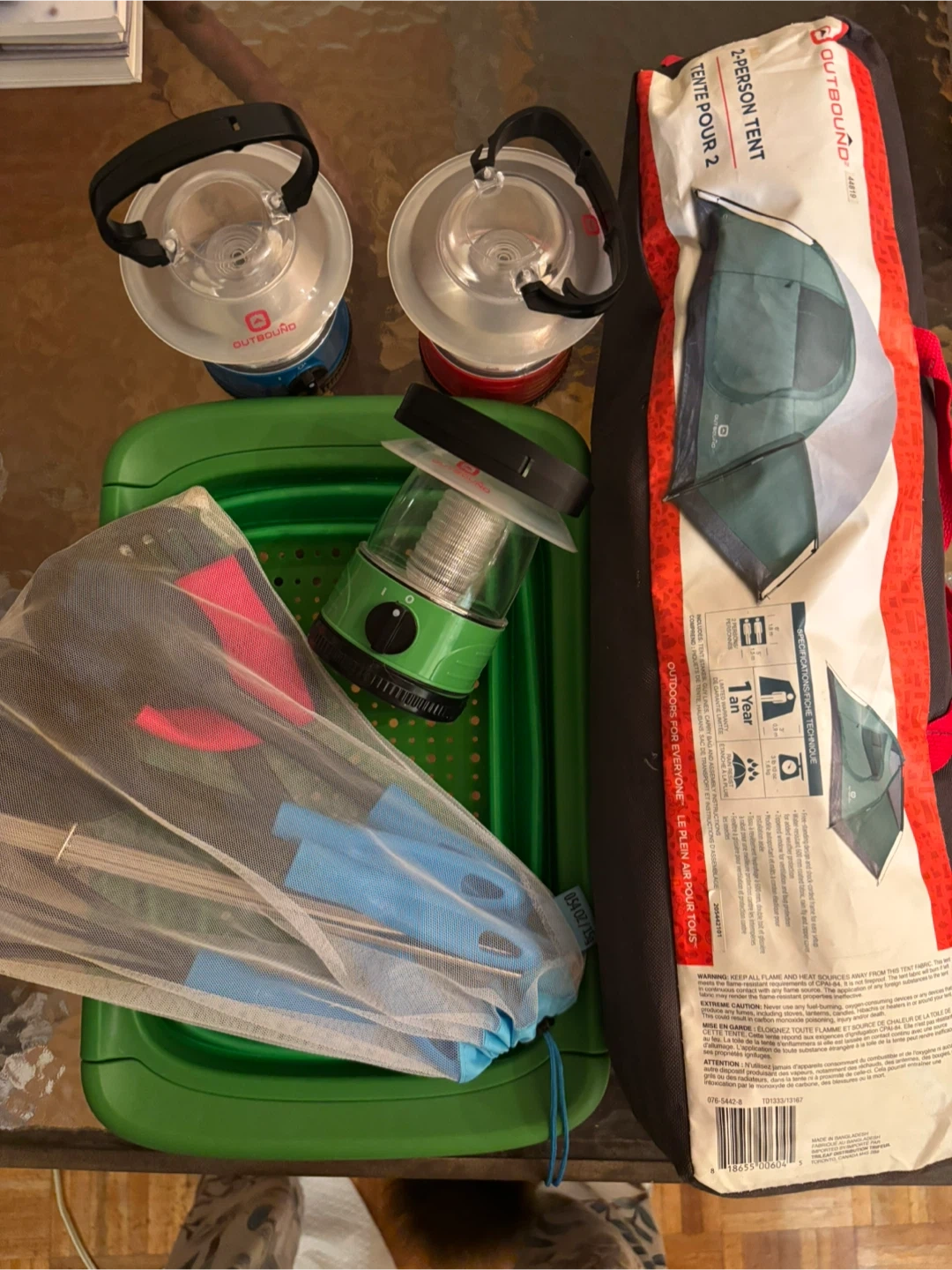 35Selling a complete set of camping gear, including an Outbound 2-person tent. The tent features a freestanding design and shock-corded poles for easy setup, plus a zippered window for ventilation. Also includes tent stakes, guy lines, a carry bag, and assembly instructions. Also included are Outbound lanterns and a green wash basin. Everything you need for a great camping trip!