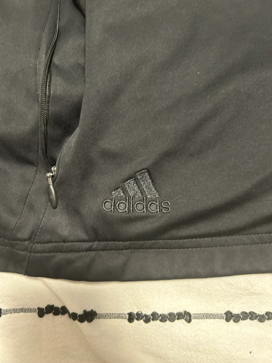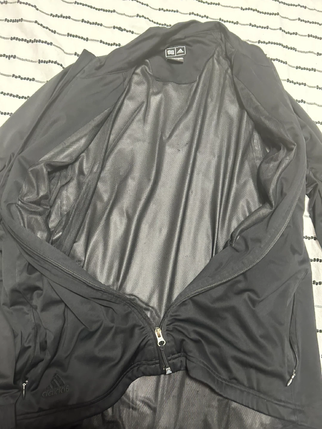 Black Adidas track jacket with the signature three stripes on the sleeves. It's made of a smooth material with a full zipper closure and zippered pockets. This jacket is great for workouts or casual wear.