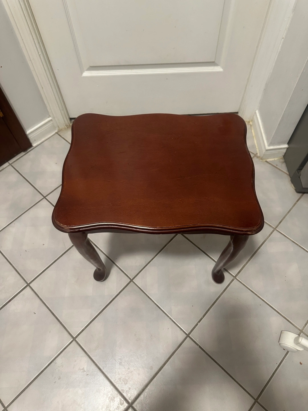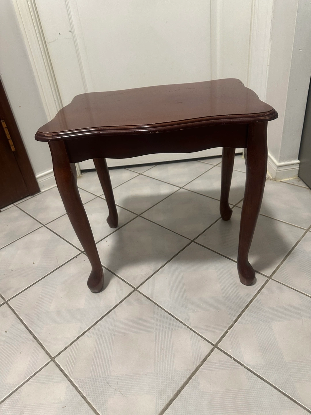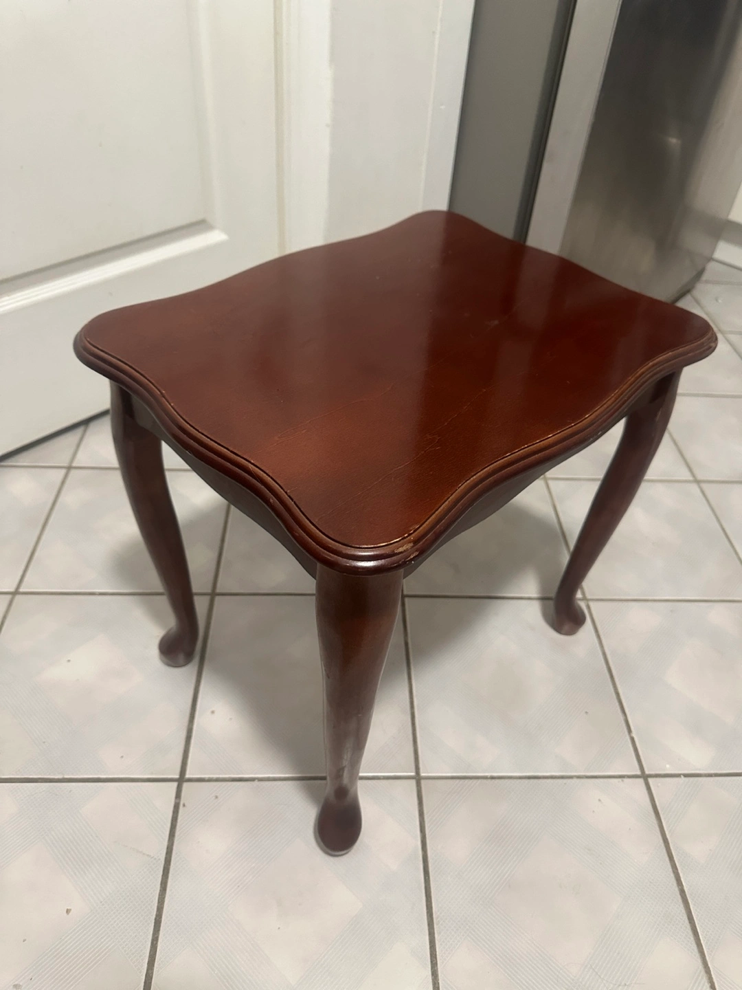 Small wooden side table. Dark brown finish. Four cabriole legs. Slightly scalloped edges on the tabletop. Perfect for a small space.