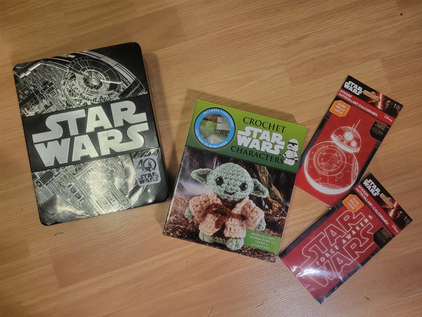 This Star Wars crochet book includes instructions to make 6 characters, and all the materials to make Yoda! If ypu want it also comes with a Star Wars themed tin and two sticker packs.