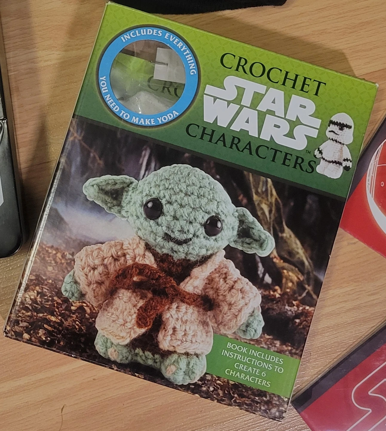This Star Wars crochet book includes instructions to make 6 characters, and all the materials to make Yoda! If ypu want it also comes with a Star Wars themed tin and two sticker packs.