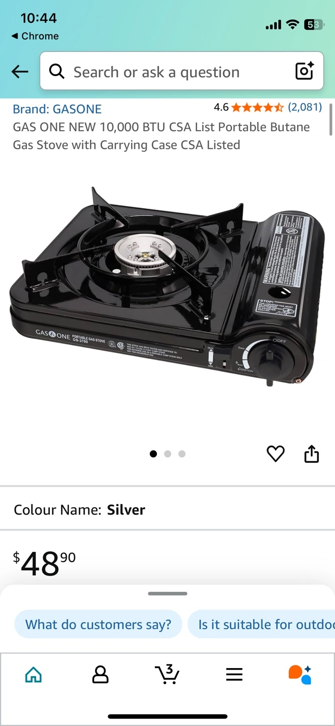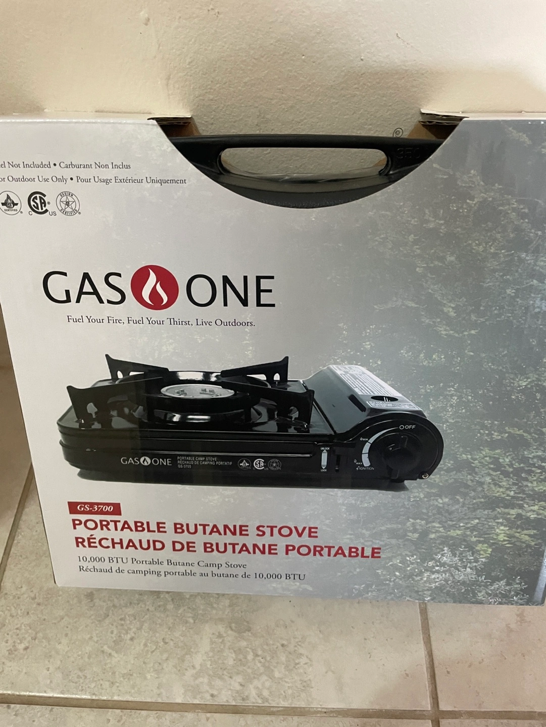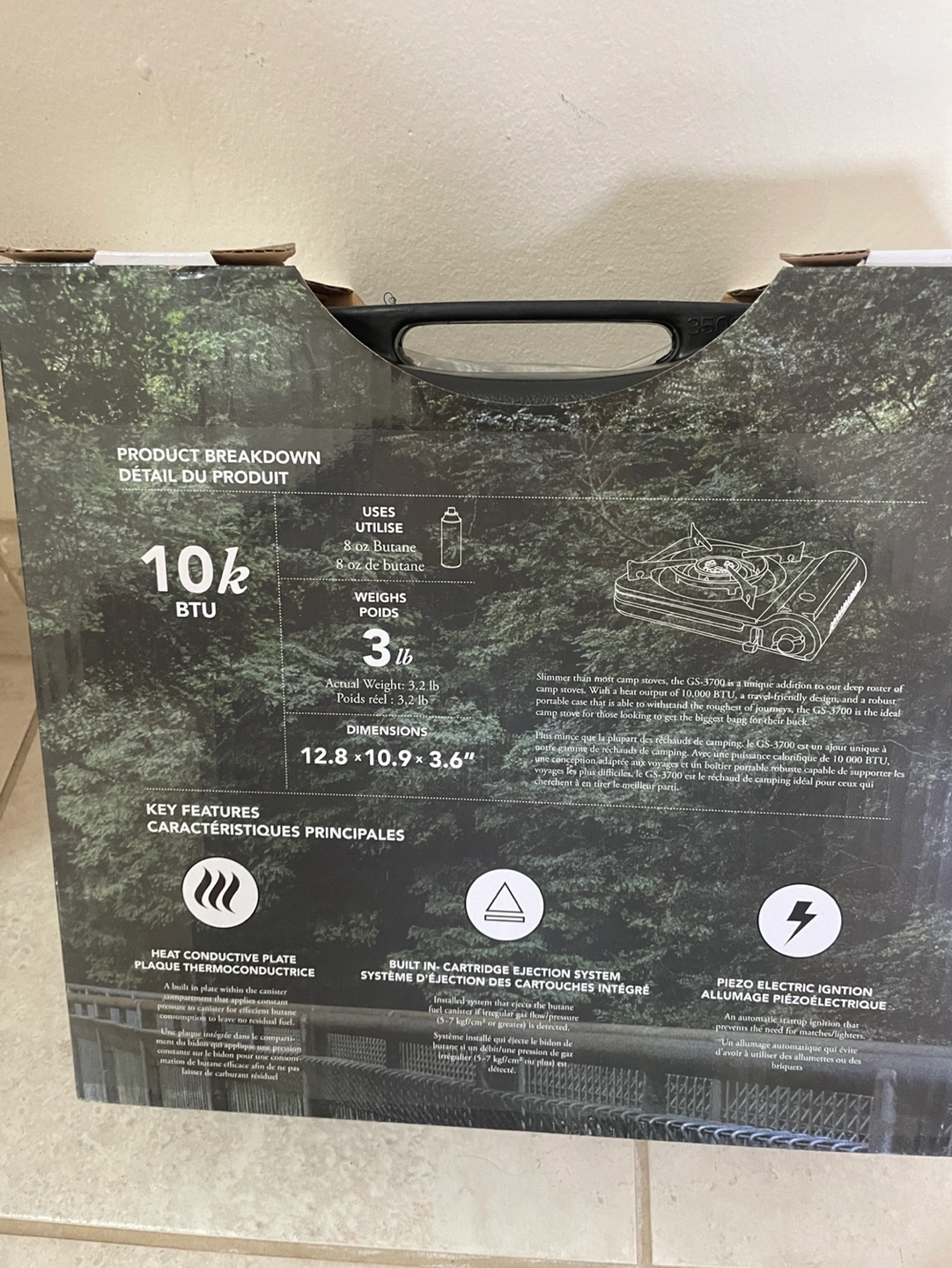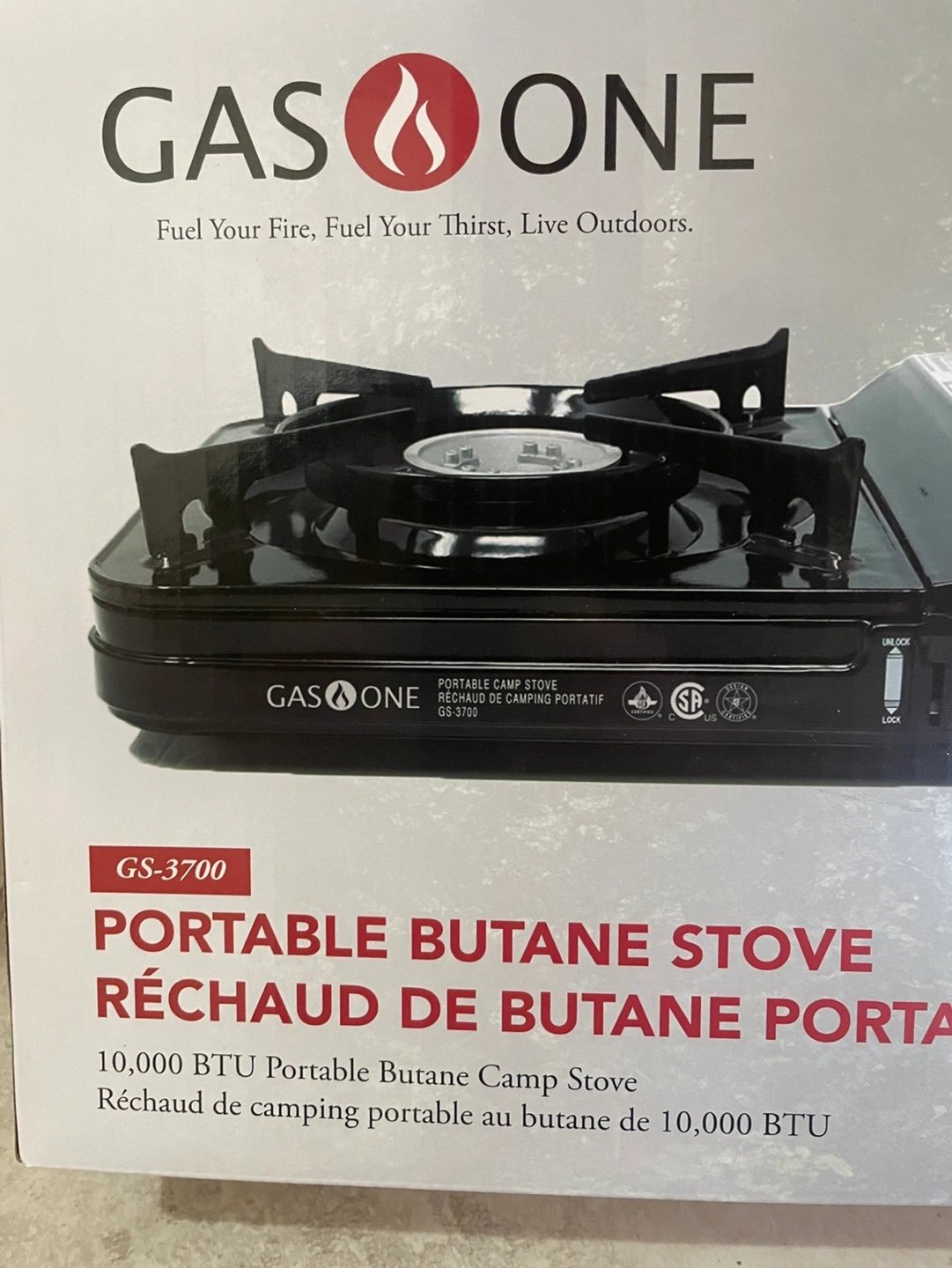 Portable butane camp stove. 10,000 BTU. CSA listed. Includes carrying case.
