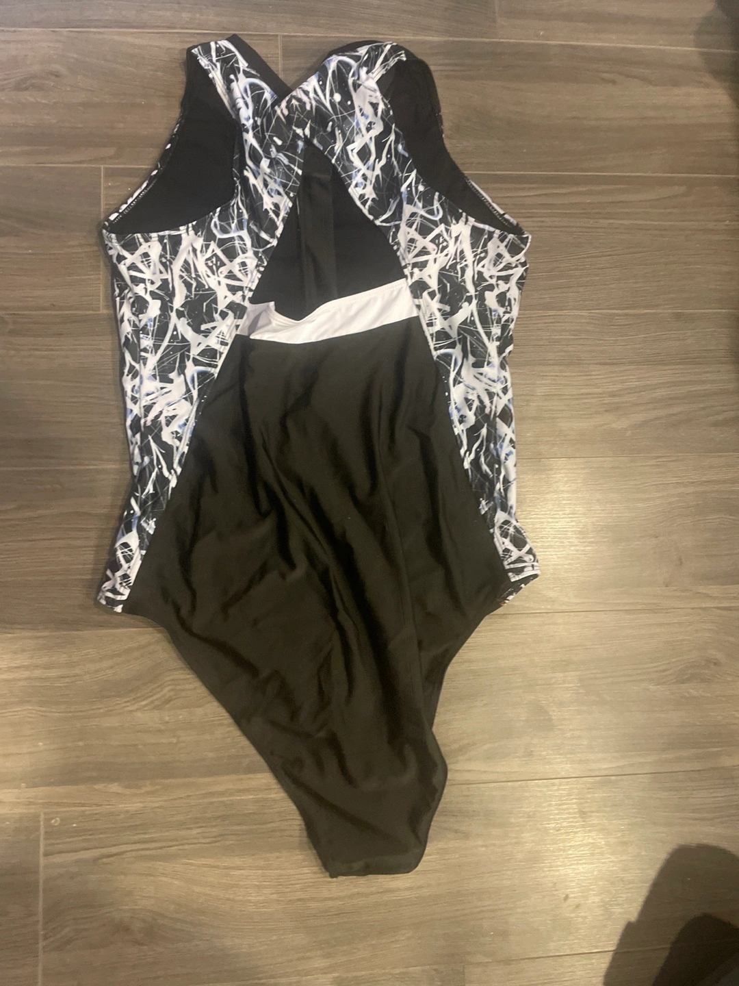 Stylish and comfortable one-piece swimsuit. Features a front zipper, sleeveless design, and a modern black and white pattern. Size 20