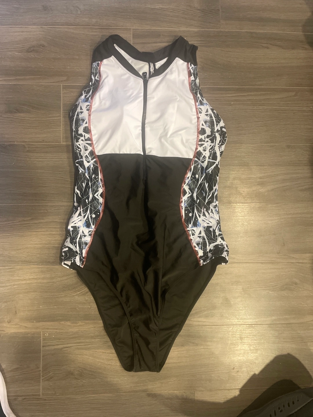 Stylish and comfortable one-piece swimsuit. Features a front zipper, sleeveless design, and a modern black and white pattern. Size 20
