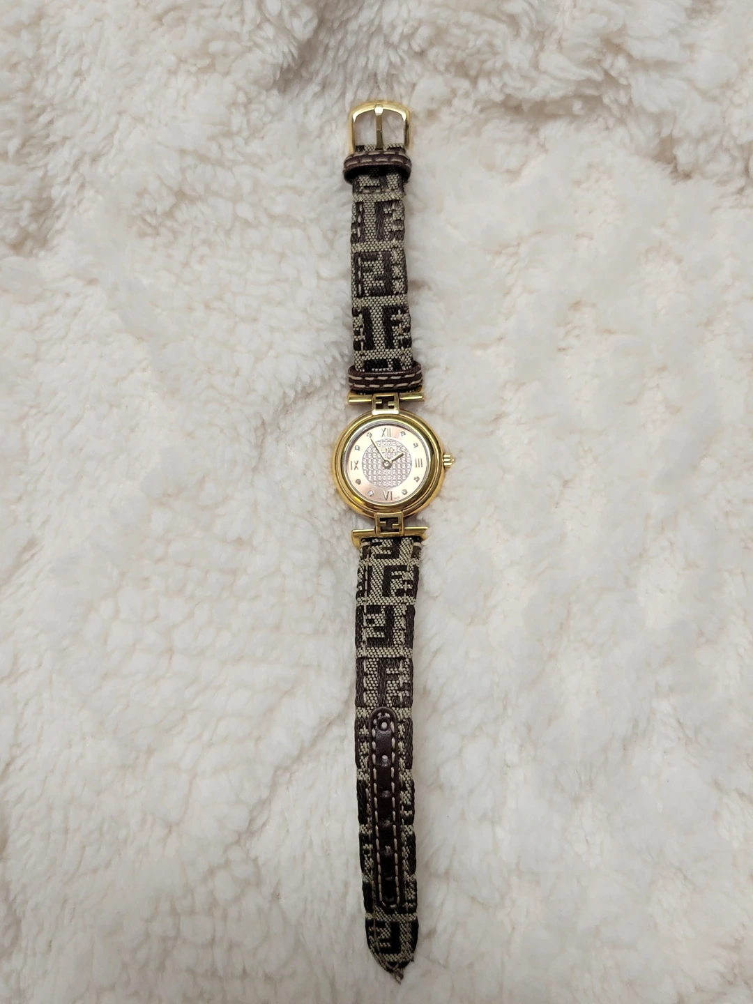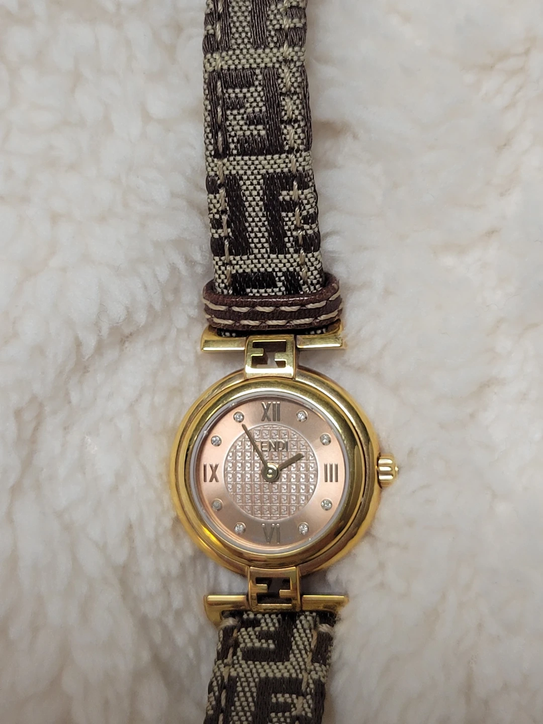 This Fendi watch features the iconic F monogram pattern on its fabric and leather strap. It has a rose gold-tone case with a pink dial and diamond hour markers. Includes original box.