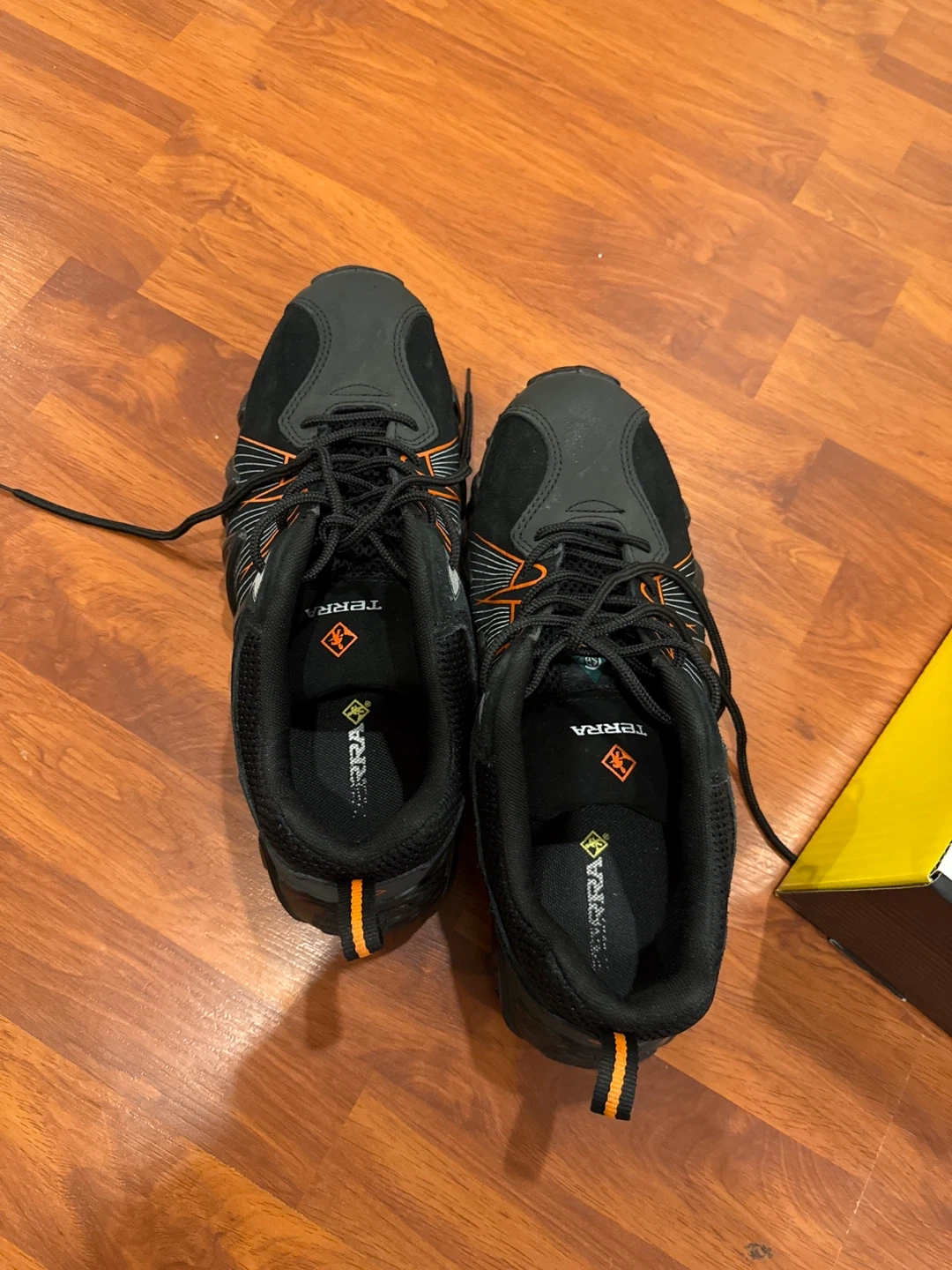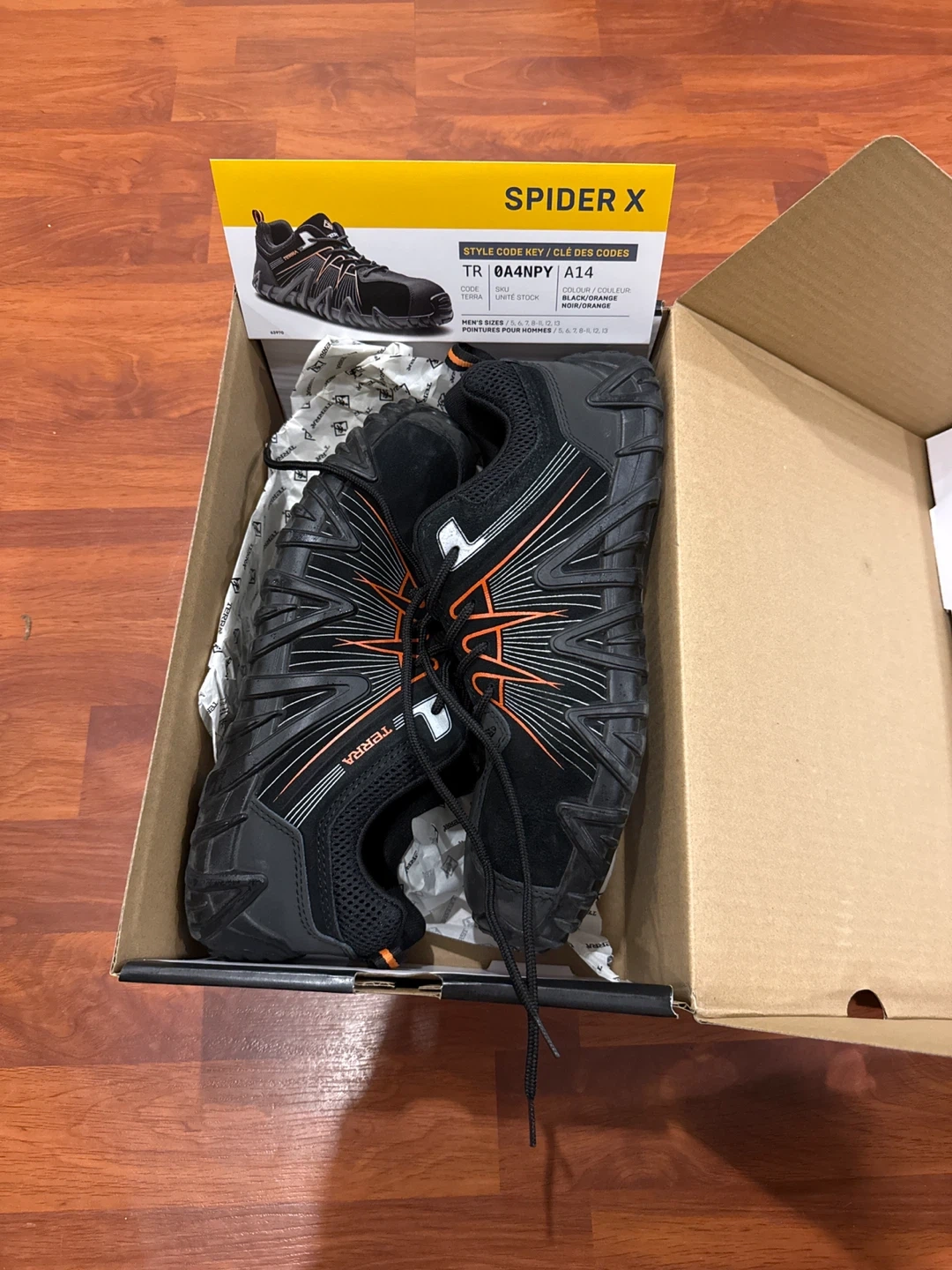17Selling a pair of Terra Spider X safety shoes for men in size 9.5. They come in a stylish black and orange colour. The shoes are brand new and come with the original box. Perfect for work or any activity requiring safety footwear!
