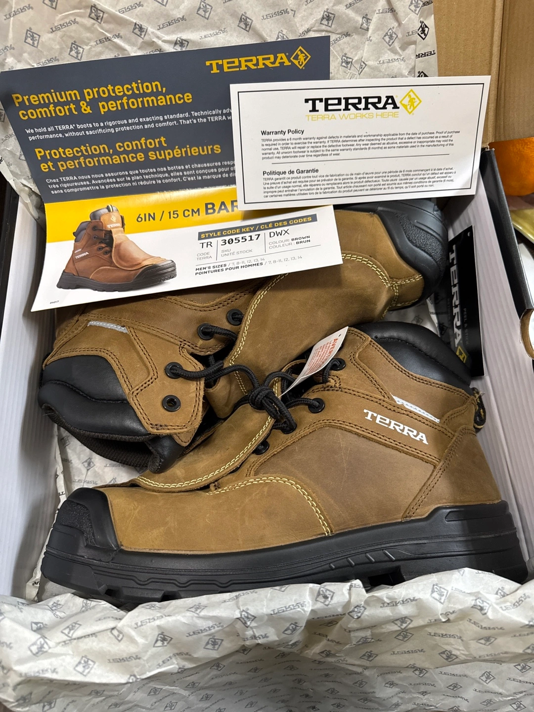 Men's brown work boots. 6-inch height. Durable construction. Premium protection, comfort and performance. New in box. Never been used