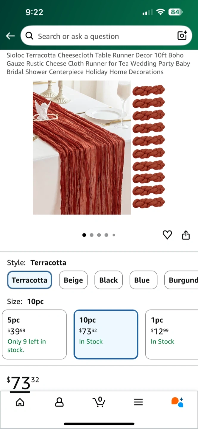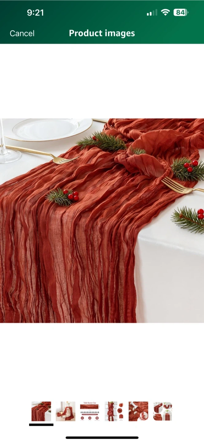 1000+Selling a 10-piece set of terracotta cheesecloth table runners! These are perfect for adding a rustic touch to your table setting. They are terracotta in colour and would be great for a party, baby shower, bridal shower or holiday decoration. Original price is $73.32 Selling entire set for $45 7 gently used one - no signs of wear 3 brand new
