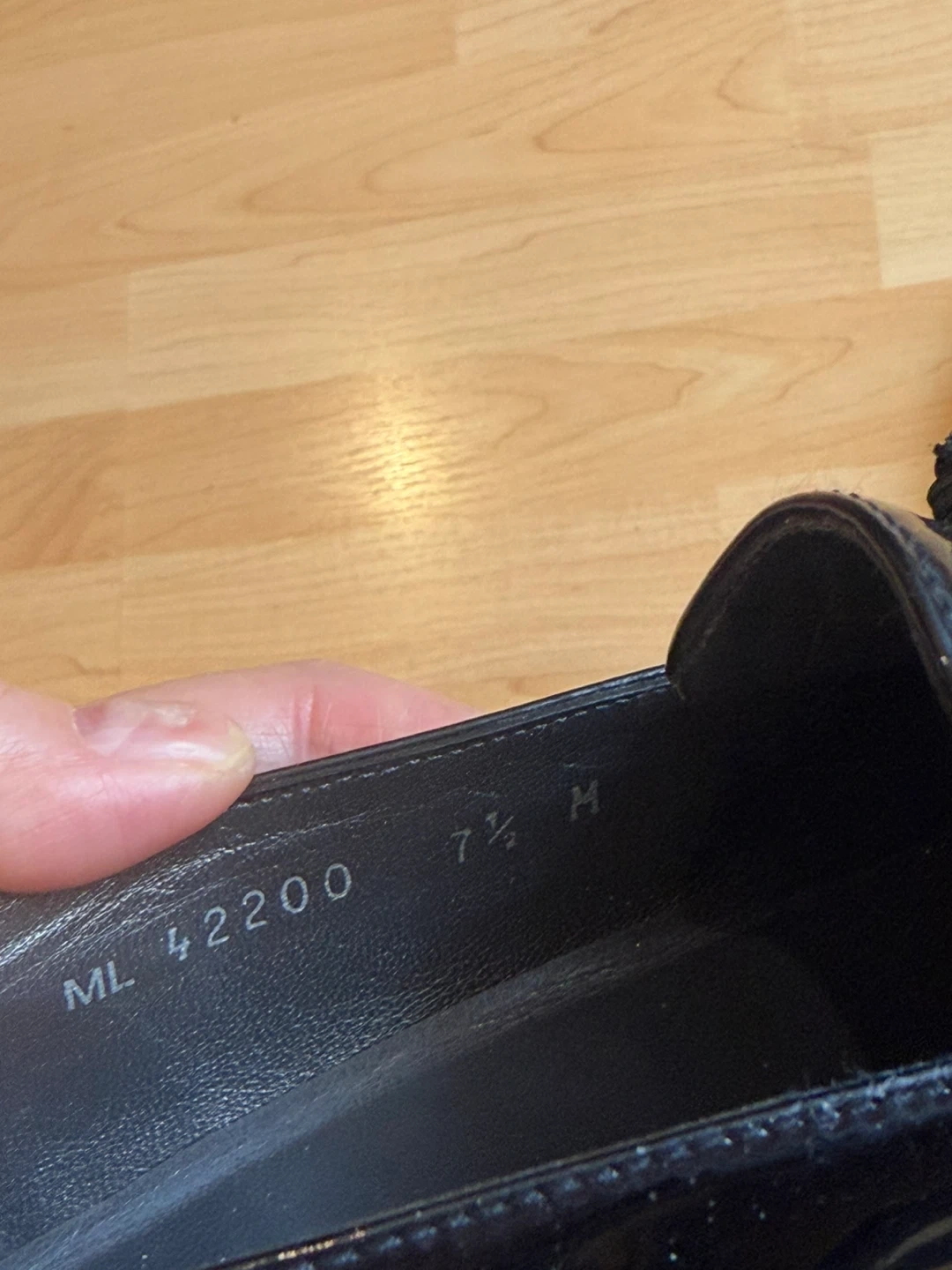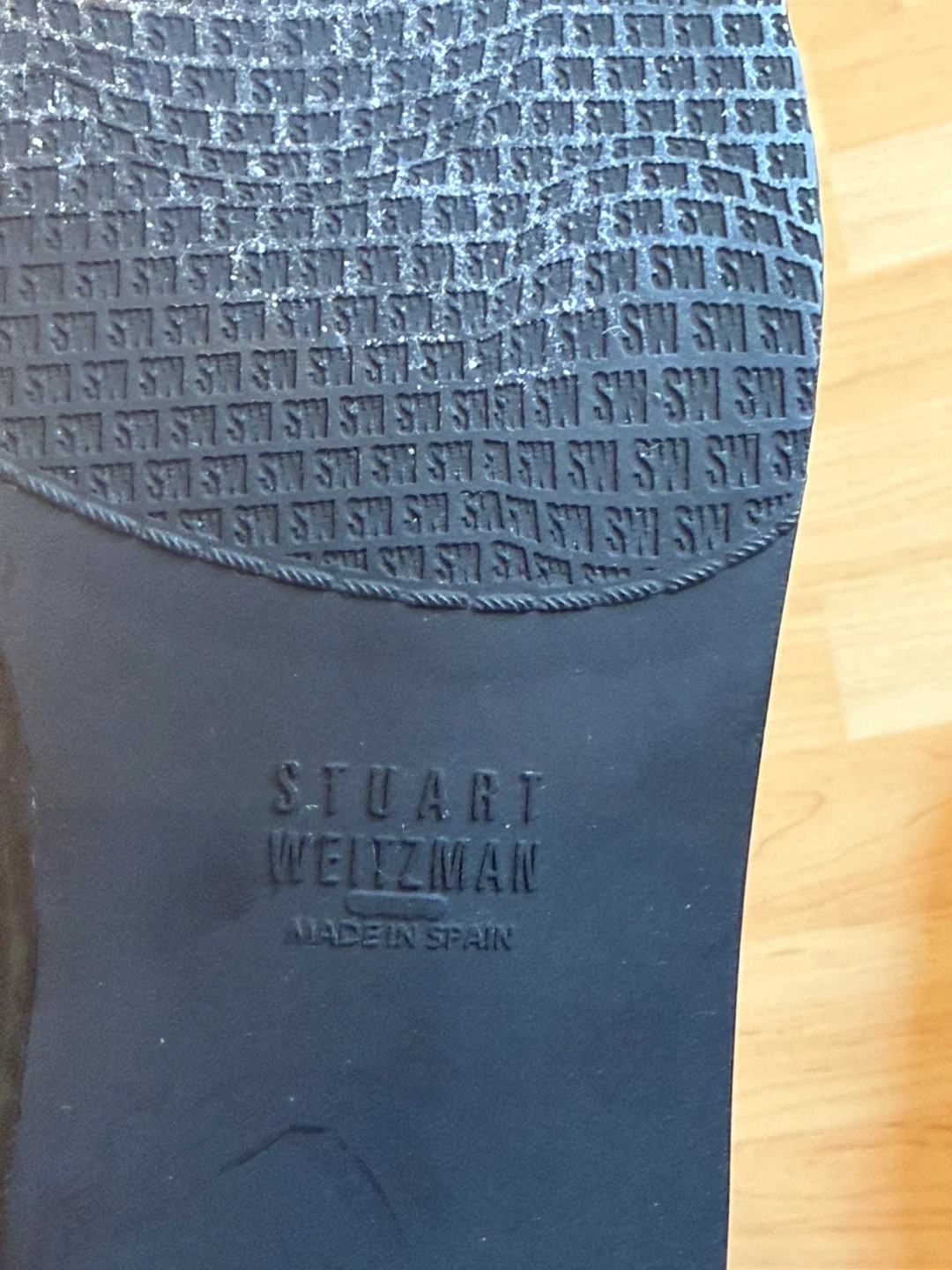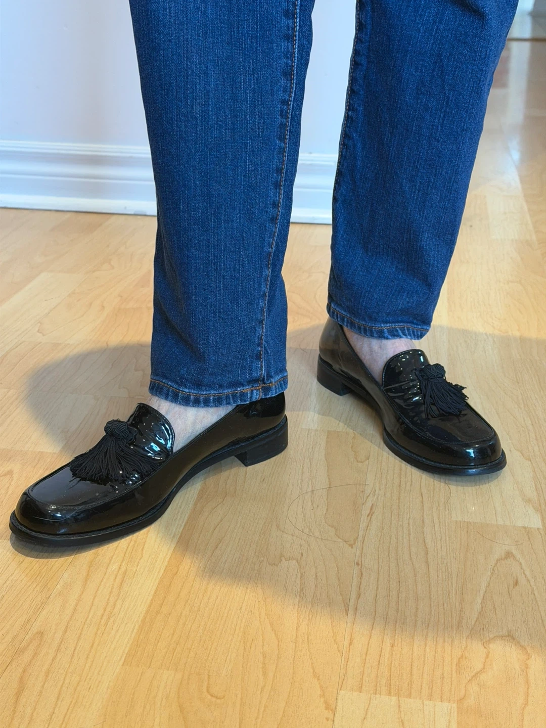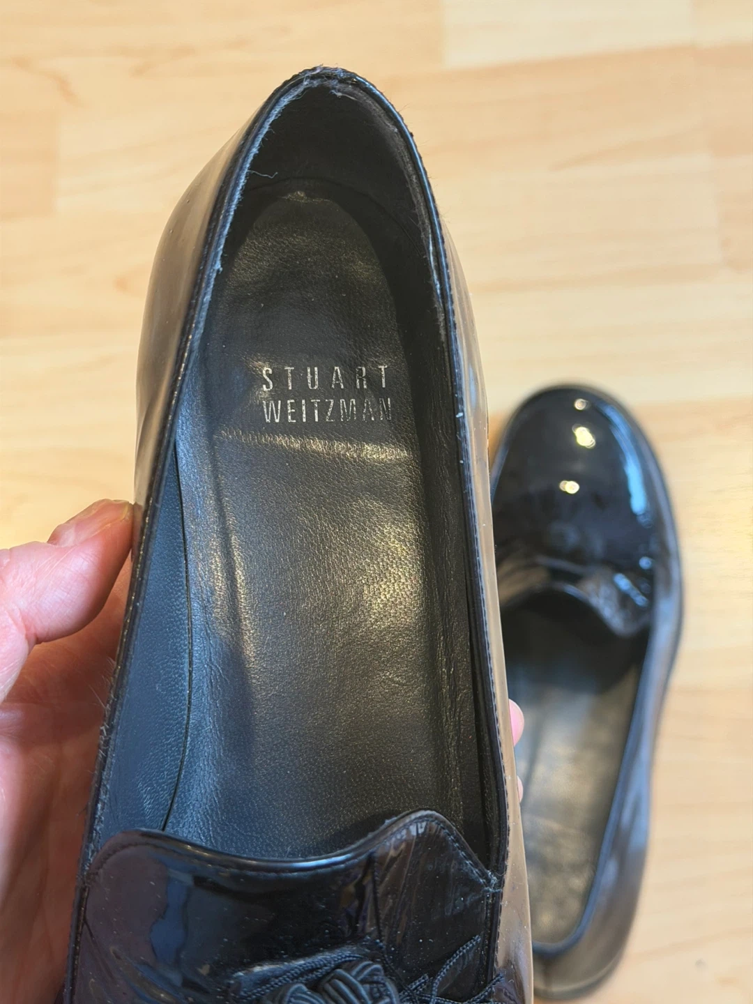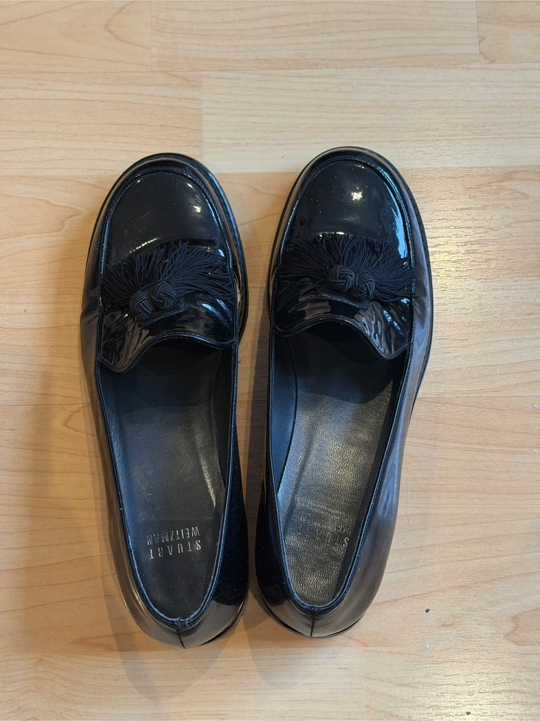 These are Stuart Weitzman black patent leather loafers. They feature a classic tassel detail on the vamp. Made in Spain. Size is 7.5. Tighter fit.