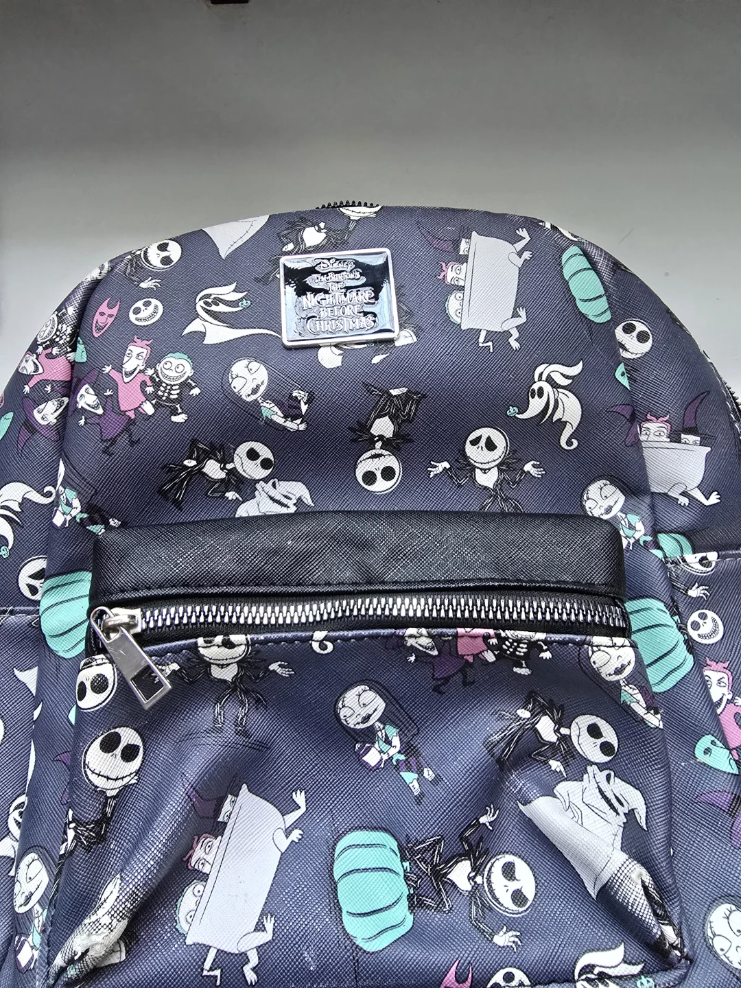 This mini backpack features a fun all-over print from The Nightmare Before Christmas. It has a zippered front pocket for easy access. A great accessory for fans of the movie!