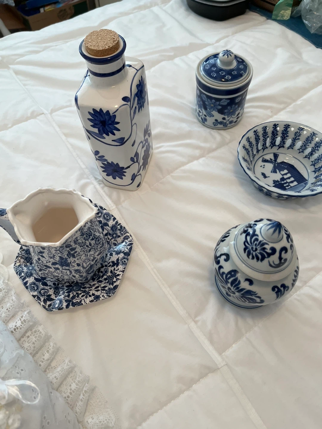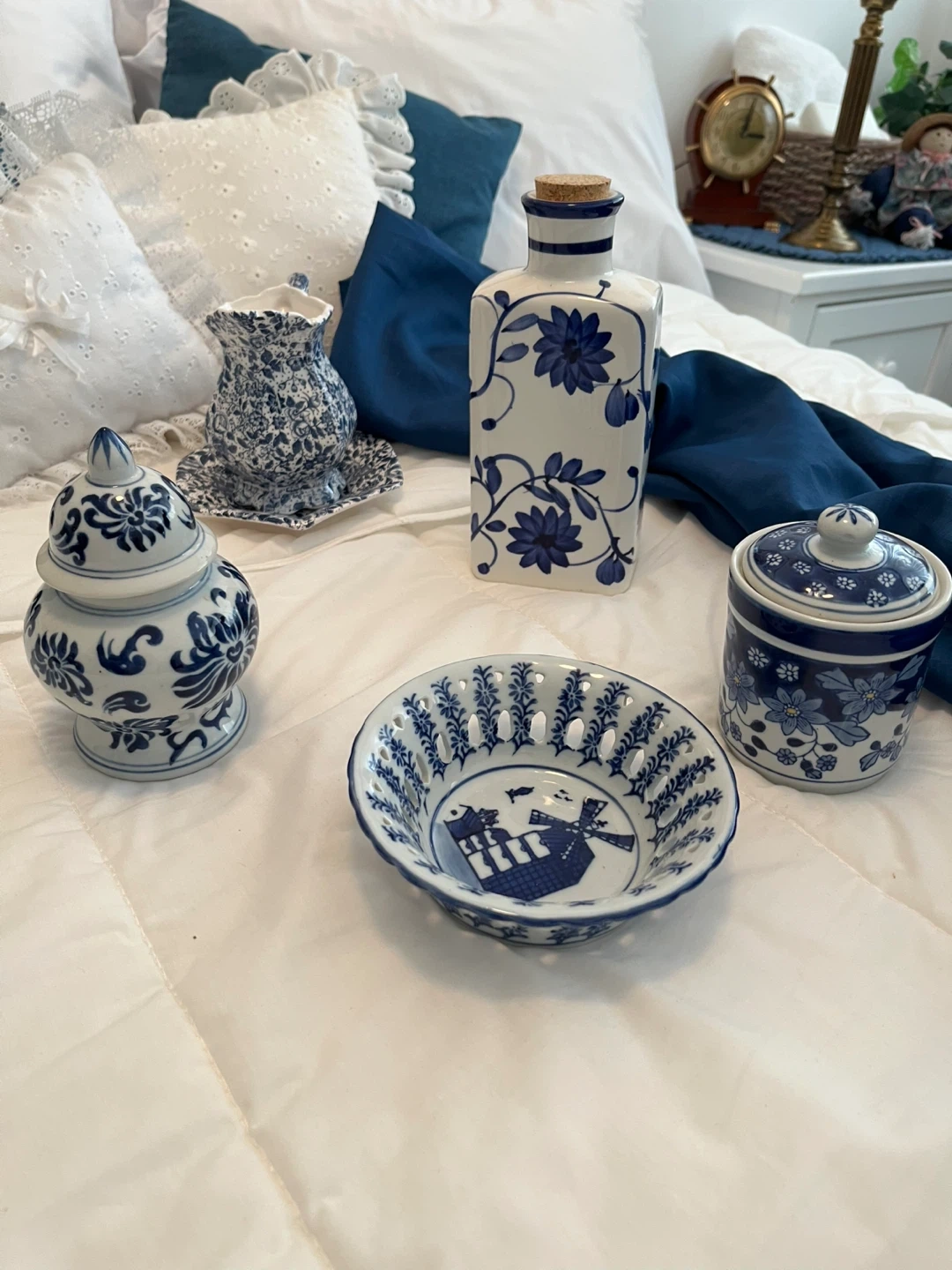 Set of decorative blue and white porcelain pieces. Includes a lidded jar, a creamer with saucer, a decorative bottle with cork, a lidded canister, and a lacy bowl with windmill detail. Perfect for adding a touch of classic style to any room!