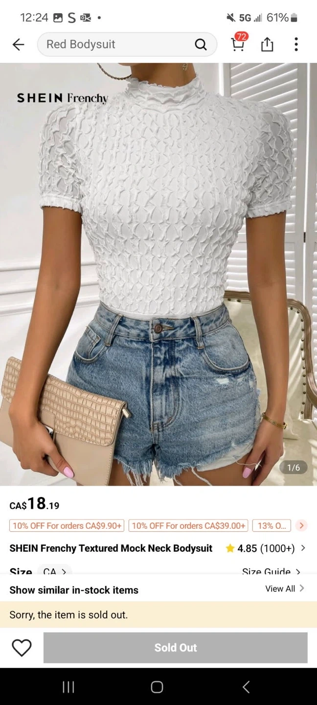 632Selling a SHEIN Frenchy textured mock neck bodysuit in white. It's a really cute piece! The material has a nice texture to it, and the mock neck gives it a bit of a dressy look. Would look great with jeans or shorts.