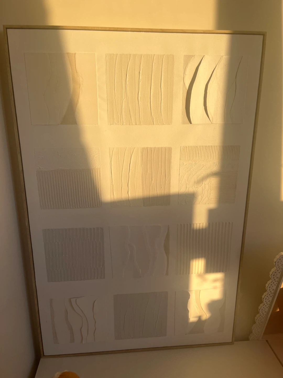 10Selling a textured white wall art piece. It features a variety of patterns and textures within a grid of squares, all in a neutral white tone. It's a great way to add some visual interest to your walls!