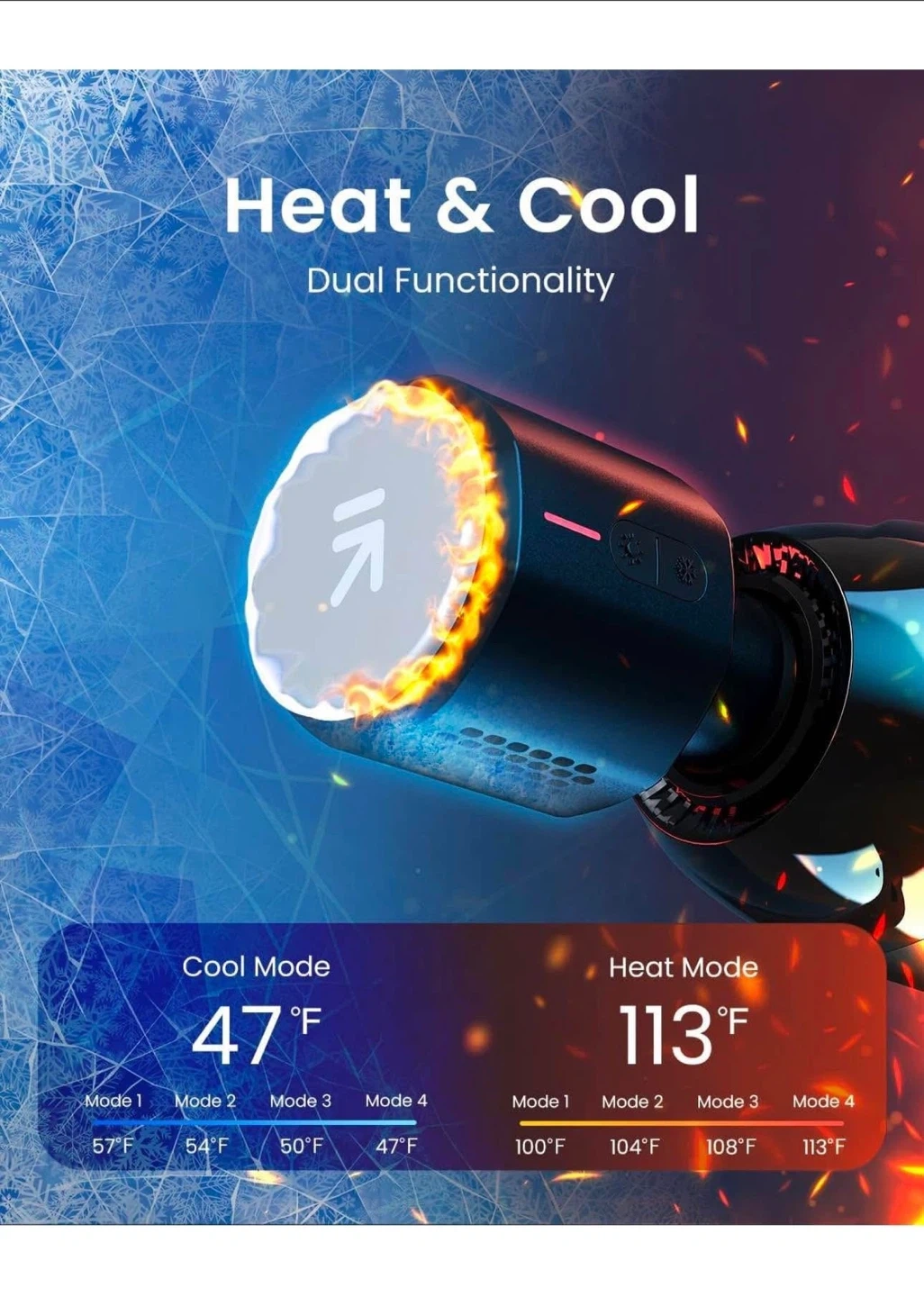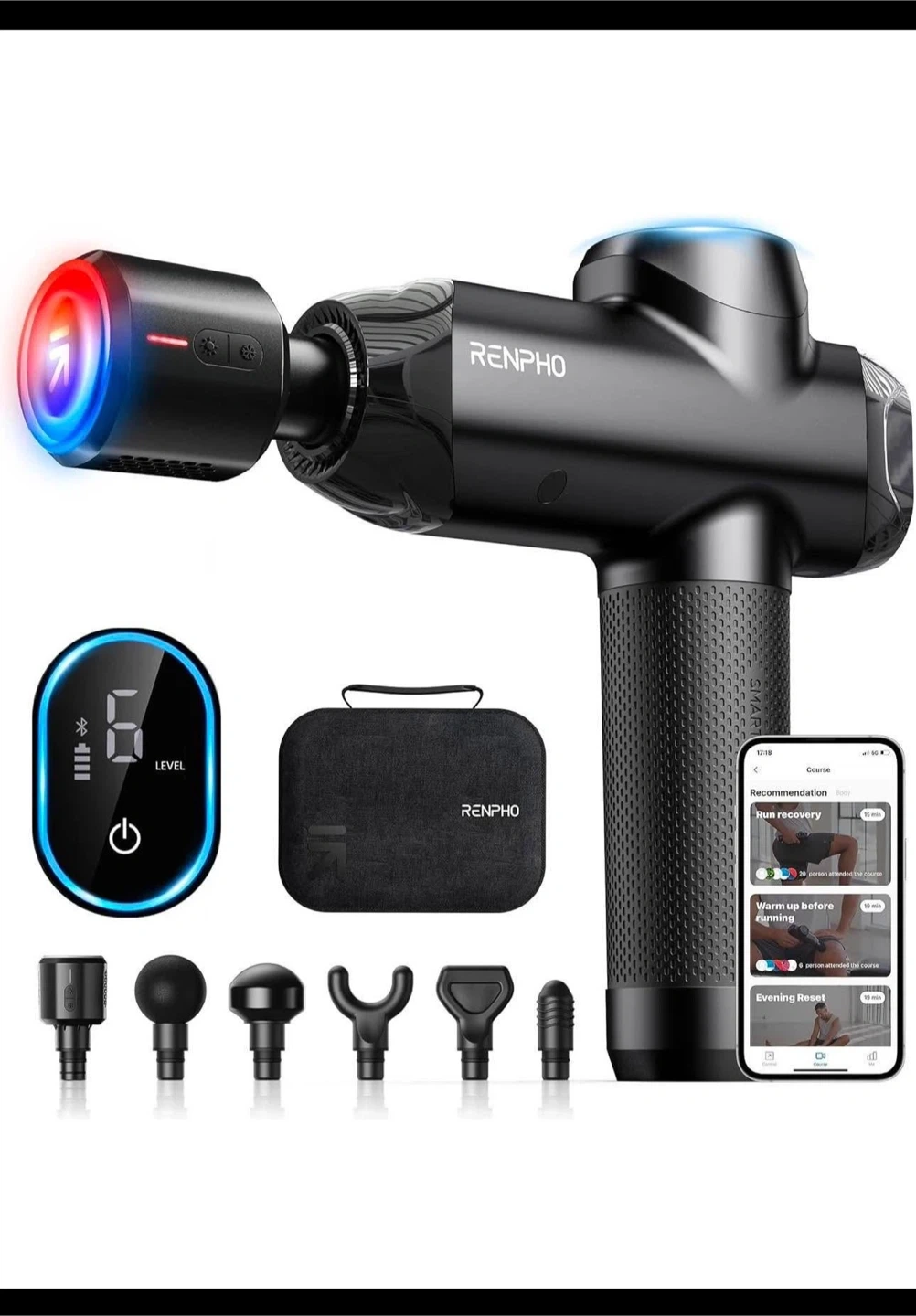 RENPHO Power + Thermacool massage gun with heat & cooling dual relief. Features 6 speed levels and 5 massage heads. Connects via Bluetooth to the RENPHO Health App for professional smart tutorials. Heat mode up to 113°F and cool mode down to 47°F.