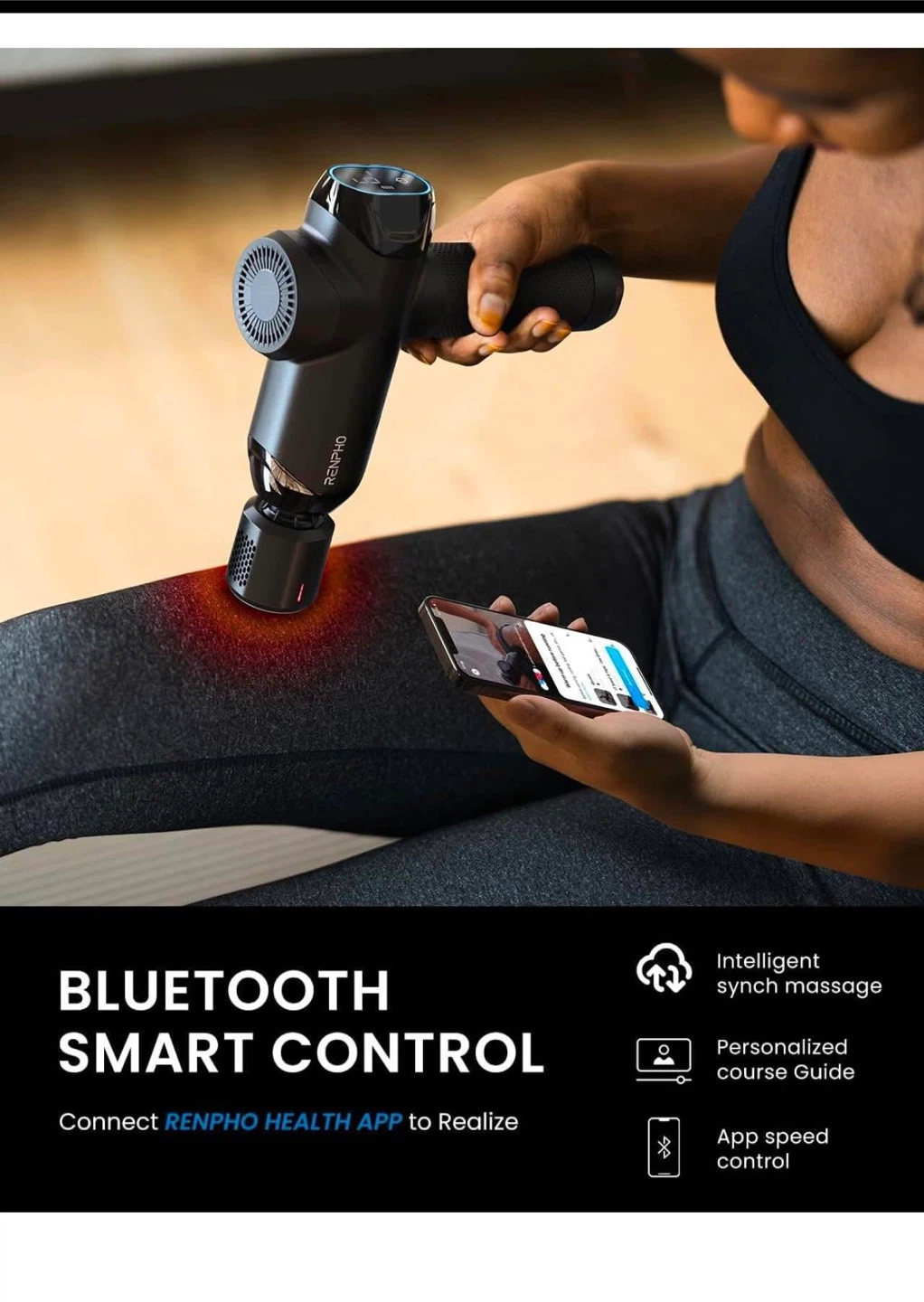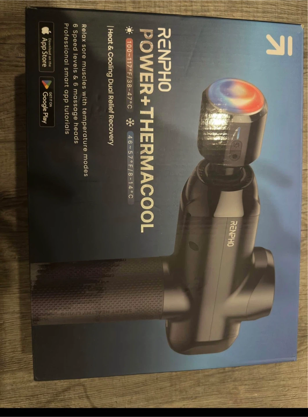 RENPHO Power + Thermacool massage gun with heat & cooling dual relief. Features 6 speed levels and 5 massage heads. Connects via Bluetooth to the RENPHO Health App for professional smart tutorials. Heat mode up to 113°F and cool mode down to 47°F.