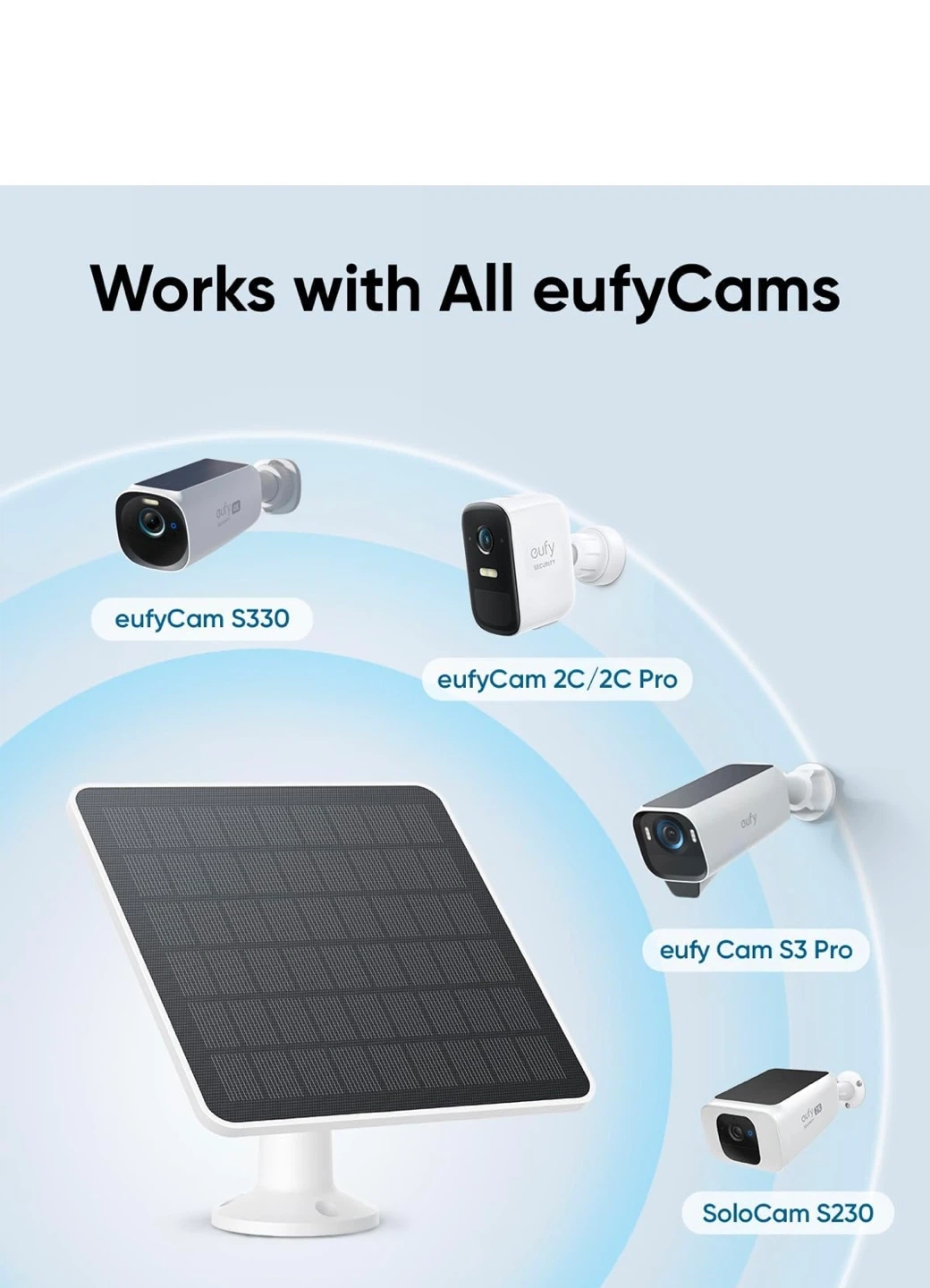 Compatible with all eufyCams: Provides continuous charging for your eufyCam 2, eufyCam 2 Pro, eufyCam 2C, eufyCam 2C Pro, eufyCam S330, and SoloCam S230.